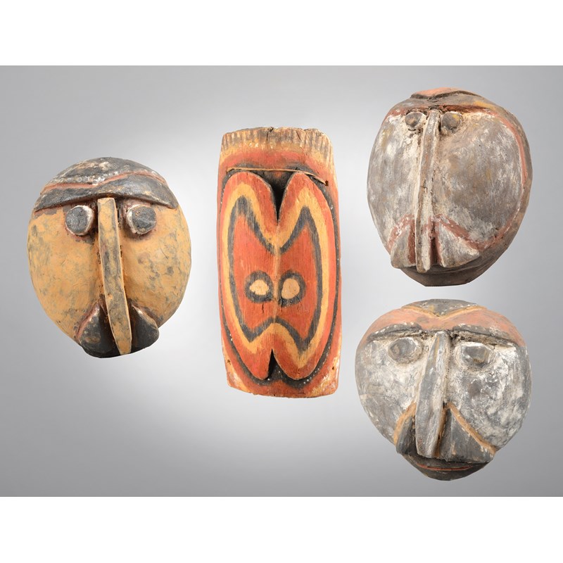 three Abelam yam masks, balsa wood with pigment, the highest 16cm, and an Abelam mask carving. (8)