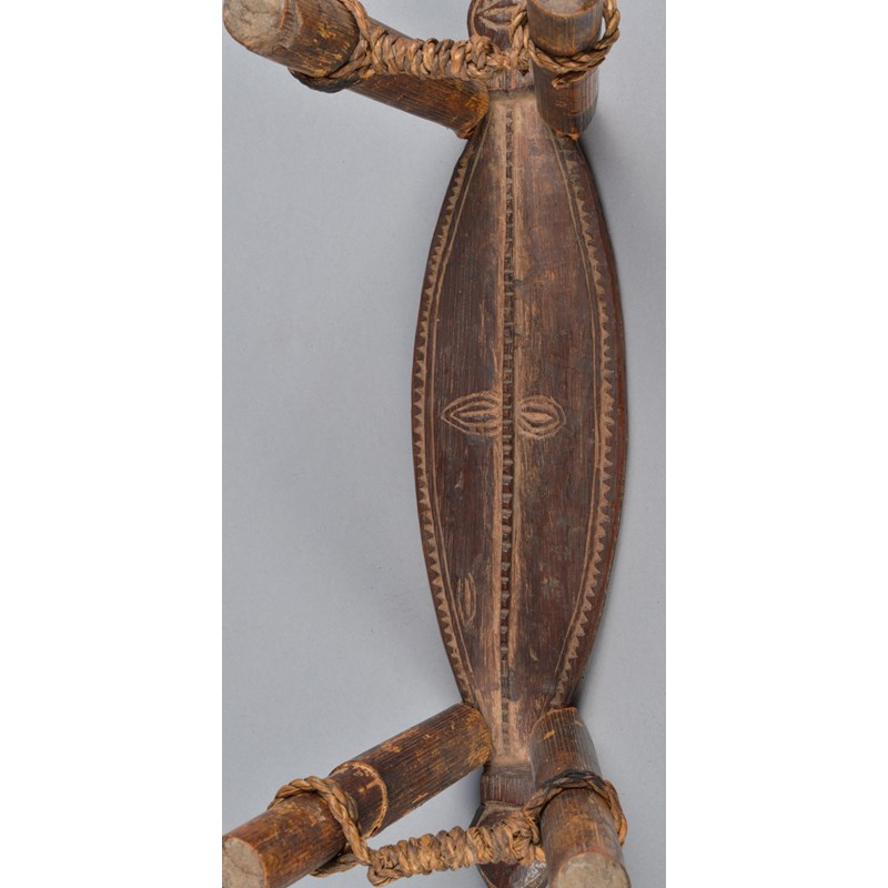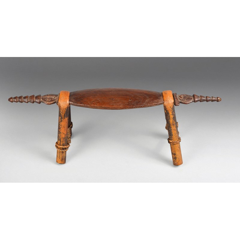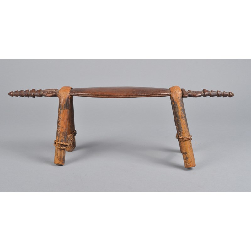 with carved ancestor head ends with tiered headdresses and a carved underside with eyes and a medial jagged ridge, on fibre bound bamboo legs, one with incised decoration,