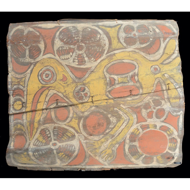 of two fibre joined panels decorated in black, yellow, red and white pigments of a bird and circles, inventory number 1090,