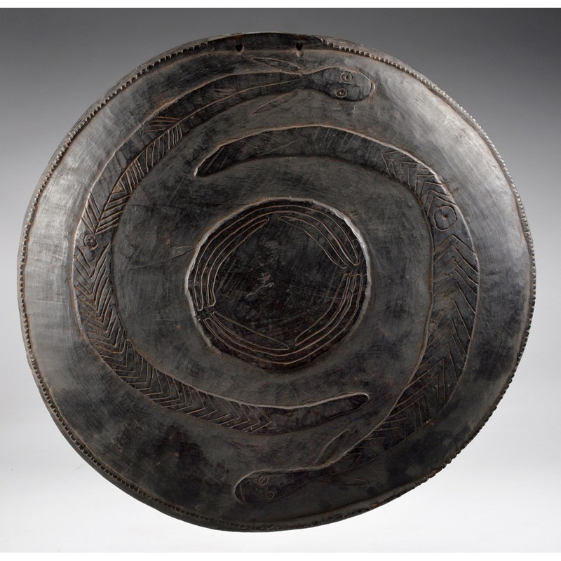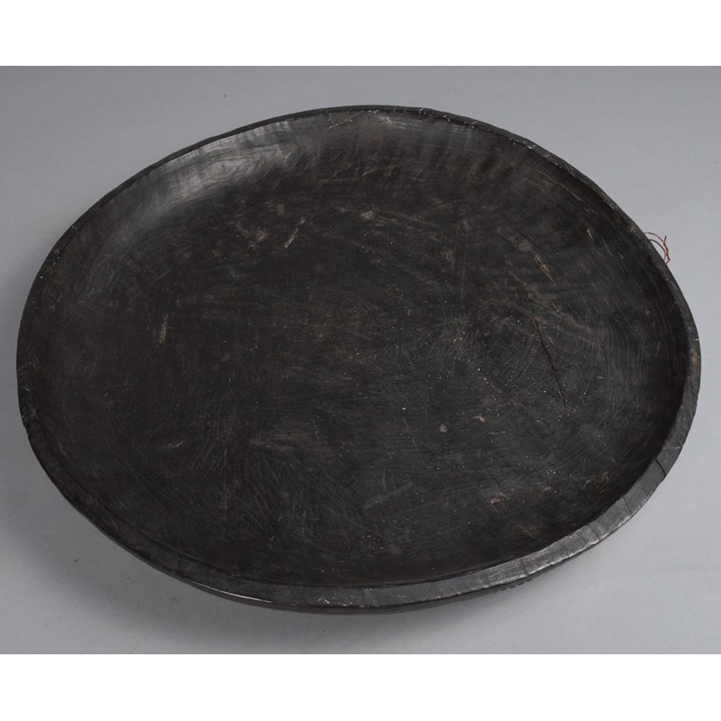 of shallow circular form, the back with carved fish and a rondal, with a serrated edge and pierced attachment lug, number 135,