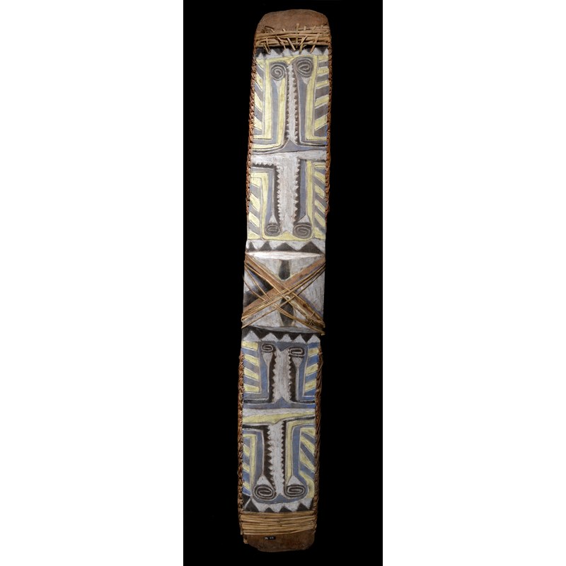 with a central boss and panels of stylised decoration with polychrome decoration and fibre bindings and woven back panels with an integral handle and with the remains of a white ground with two black dots, inventory number 125,