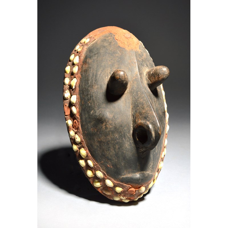 with protruding eyes and pierced nose, with a red paste border inset cowrie shells,
