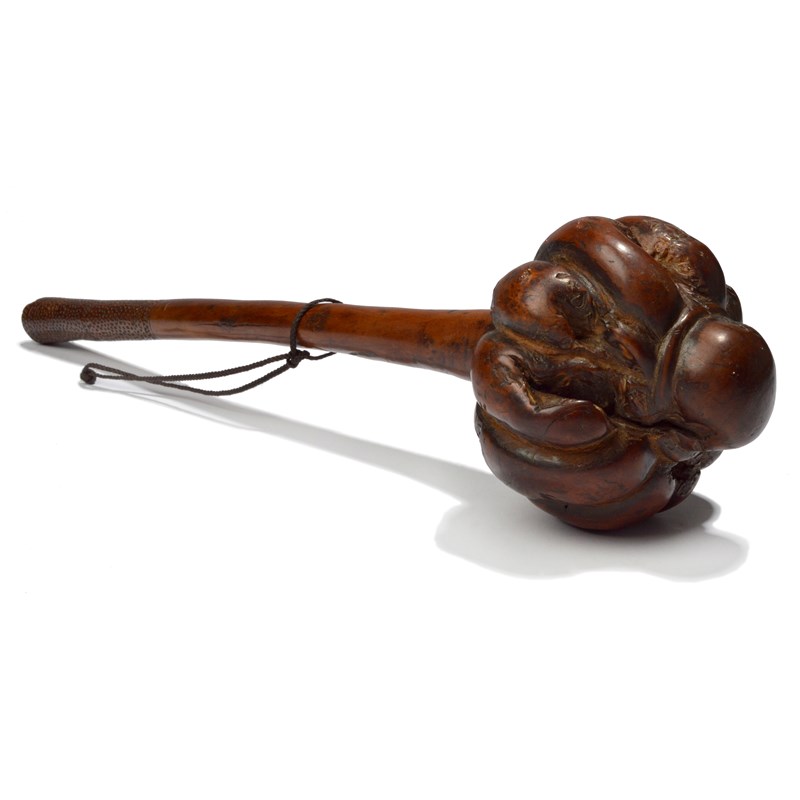 with a lobed head and a carved zig-zag grip, the butt with a circular depression,