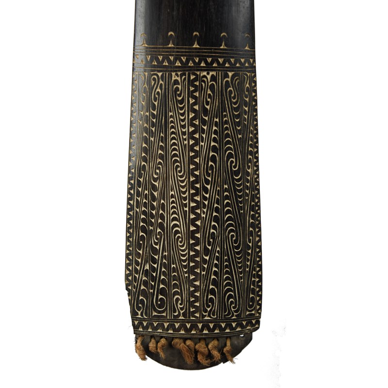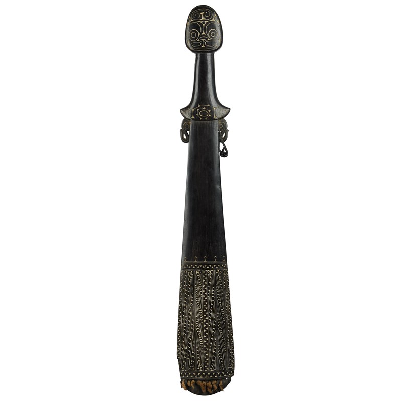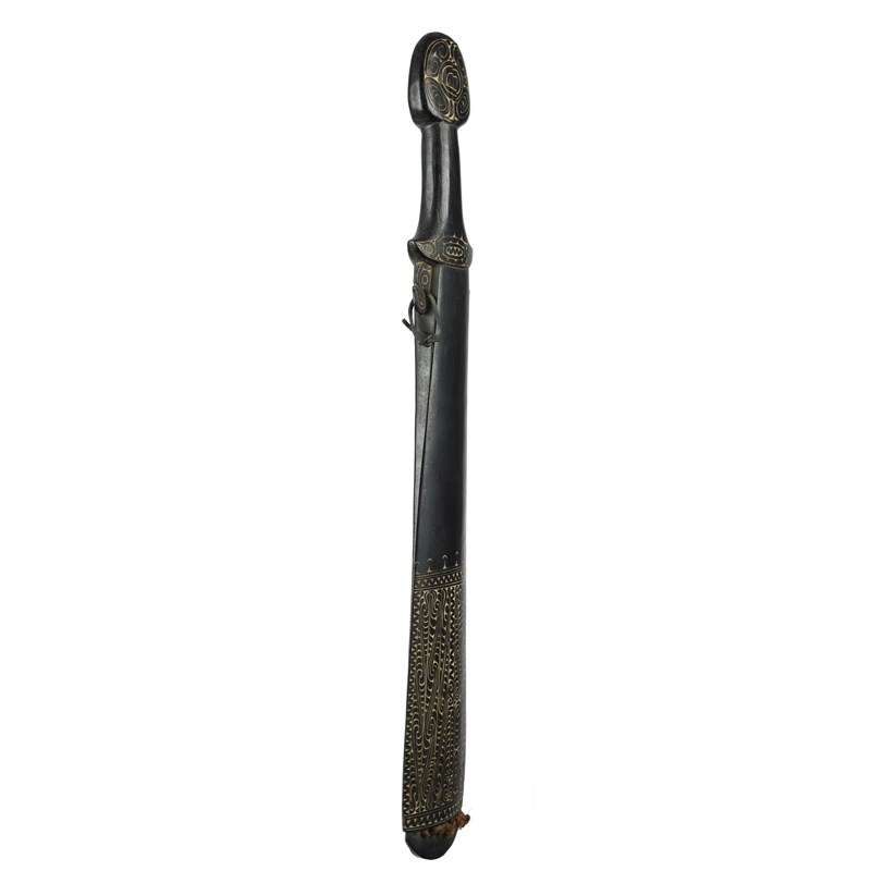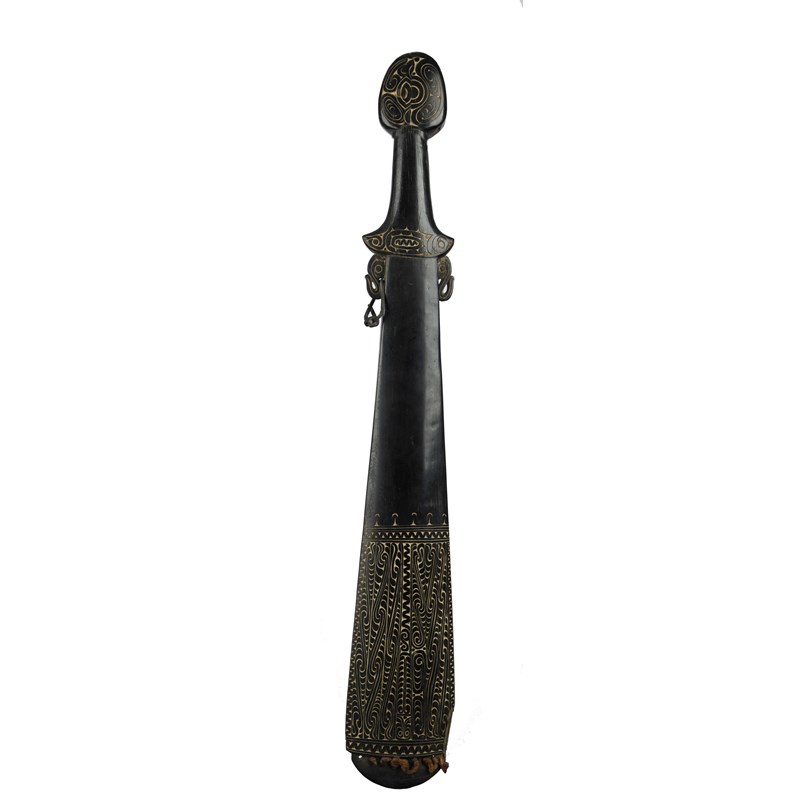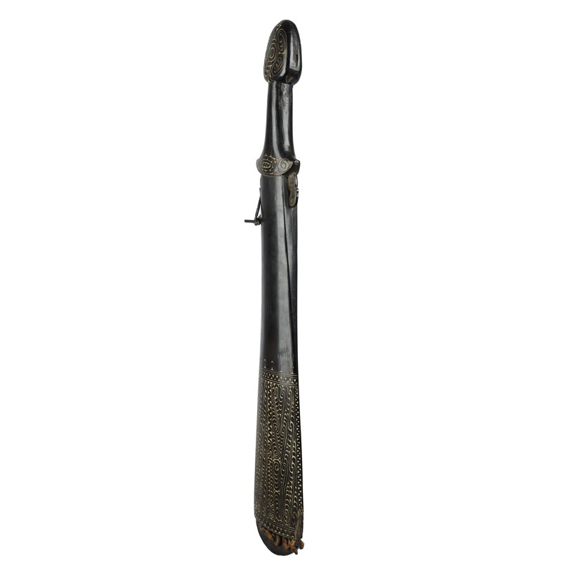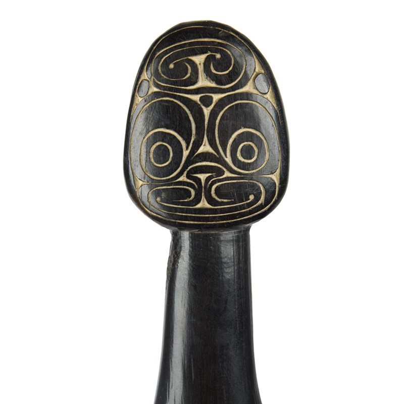 with carved and lime filled decoration, the end of the blade pierced and with knotted fibre,