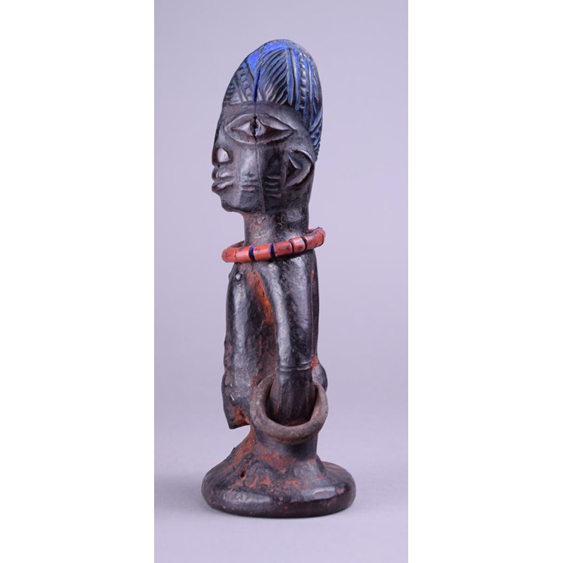 wood, with a domed coiffure and remains of Reckitt's Blue, facial scarifications and wrist bands, with remains of camwood powder, with a bead band and two metal bands,