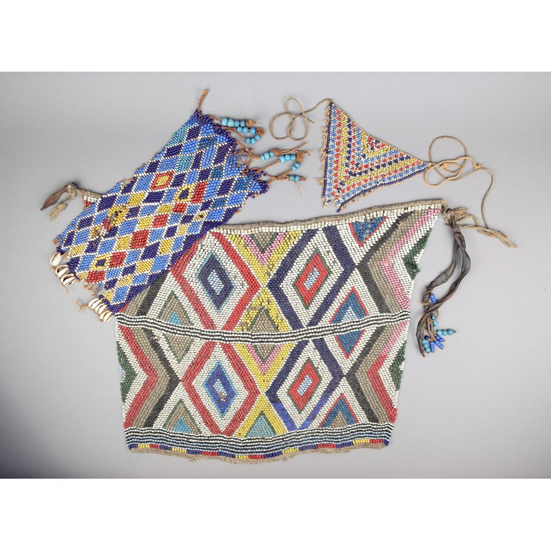 beadwork with a geometric design and of flared rectangular form, with remain of leather belt,