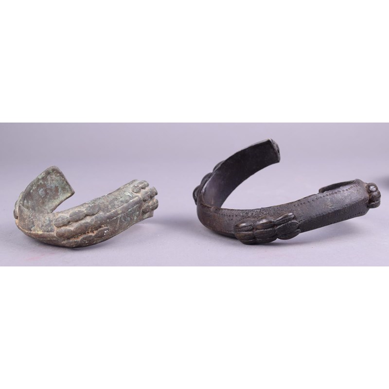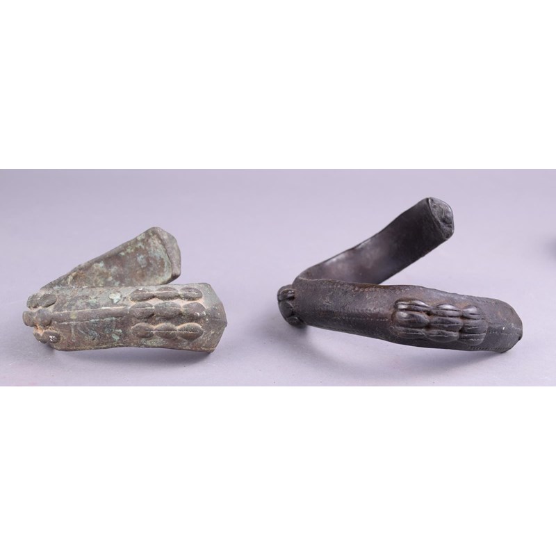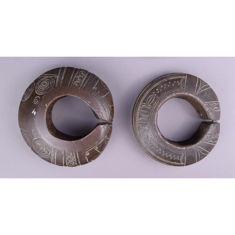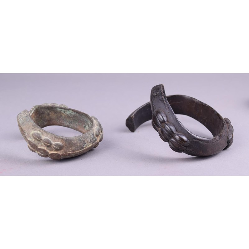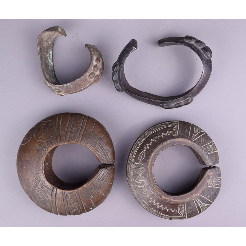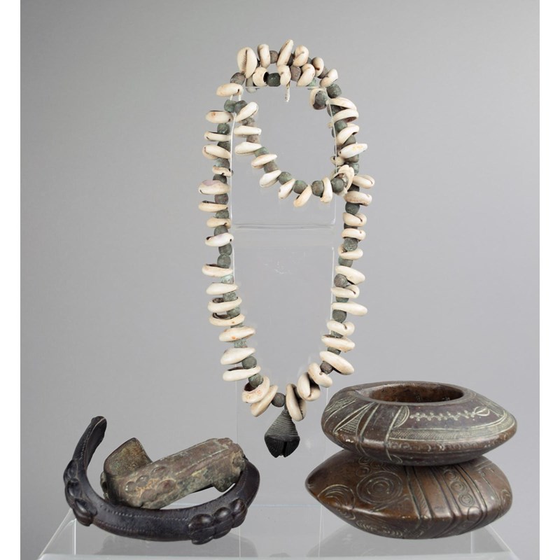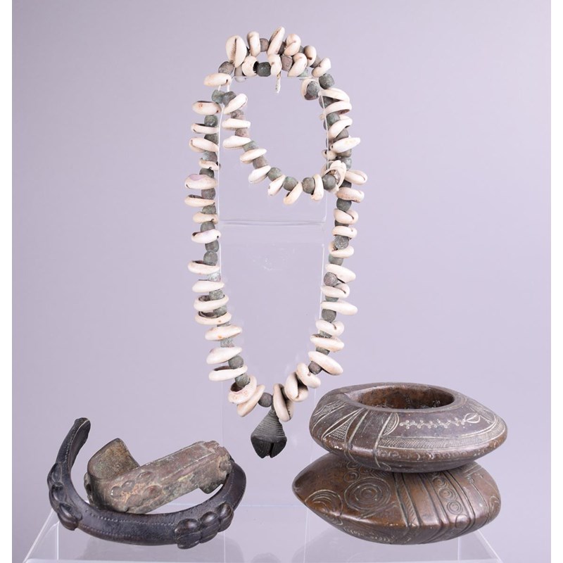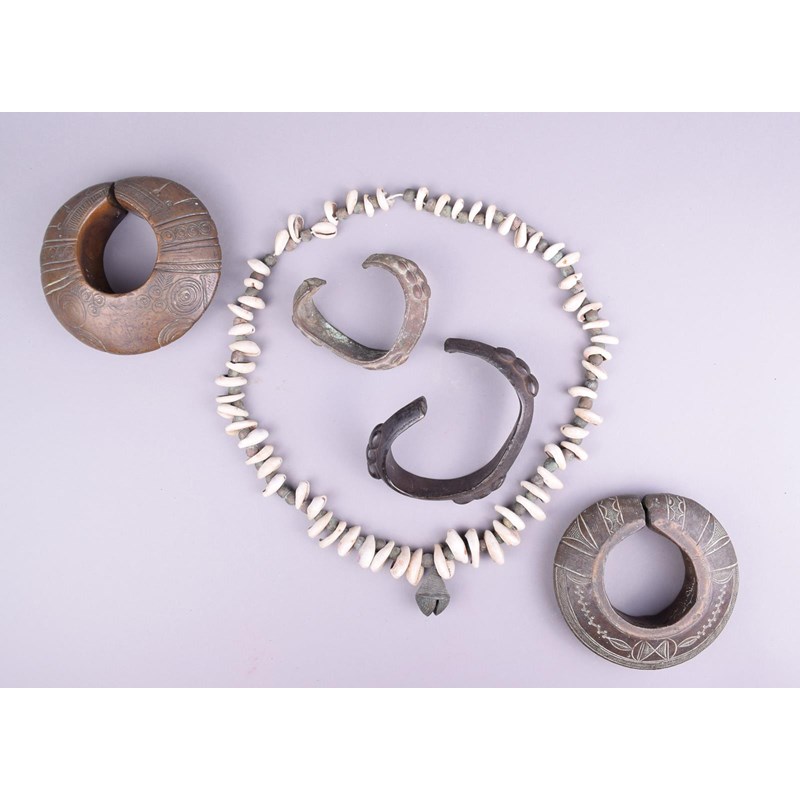 two heavy bronze currency bangles with linear and circle decoration, and a cowrie shell and brass bead necklace with a bell pendant. (5)