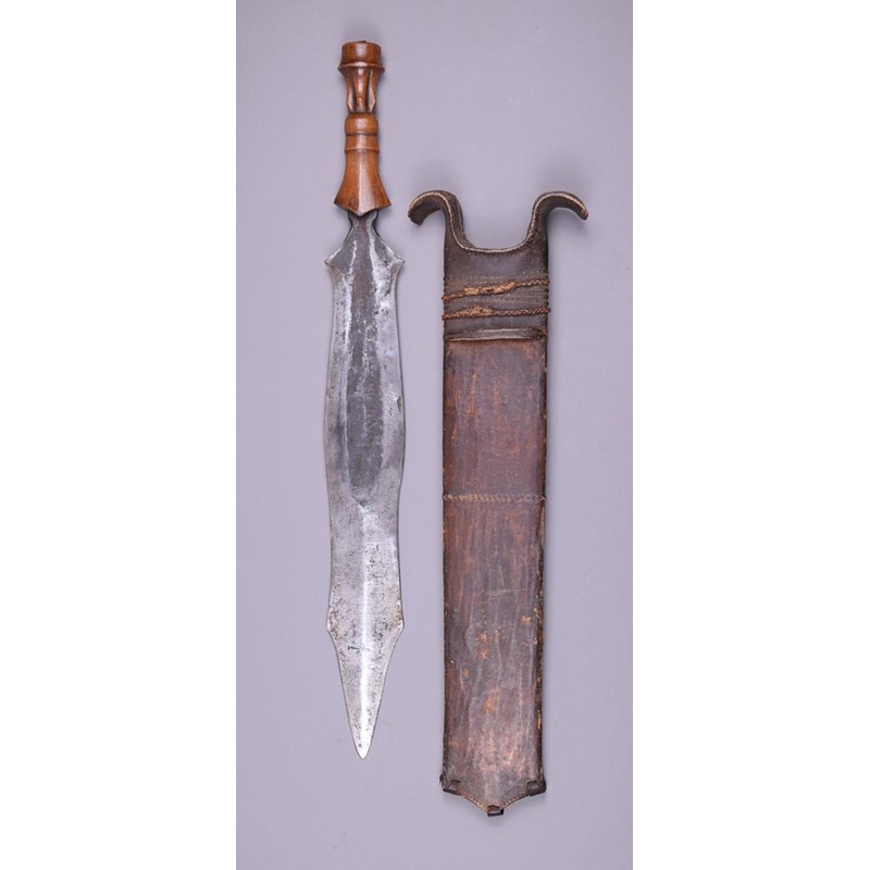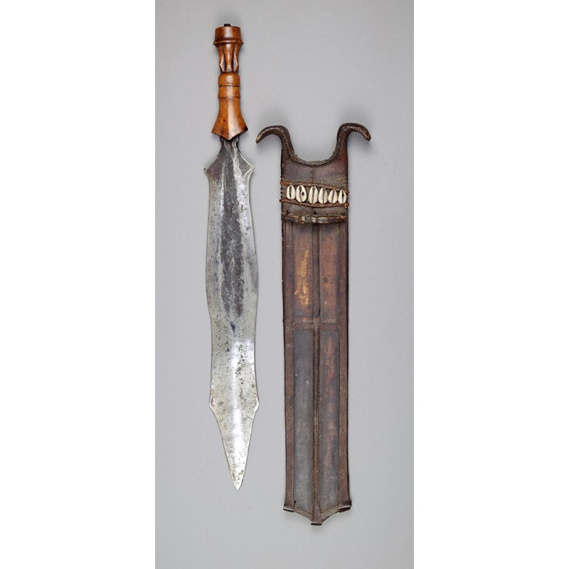 A Salampasu short sword with scabbard Mpuku Democratic Republic of Congo with a shaped blade and...