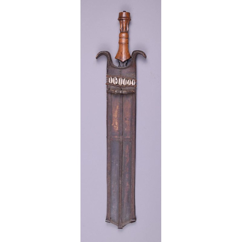 with a shaped blade and carved wood handle, the vellum covered scabbard with three metal strips and a row of fibre framed cowrie shells,