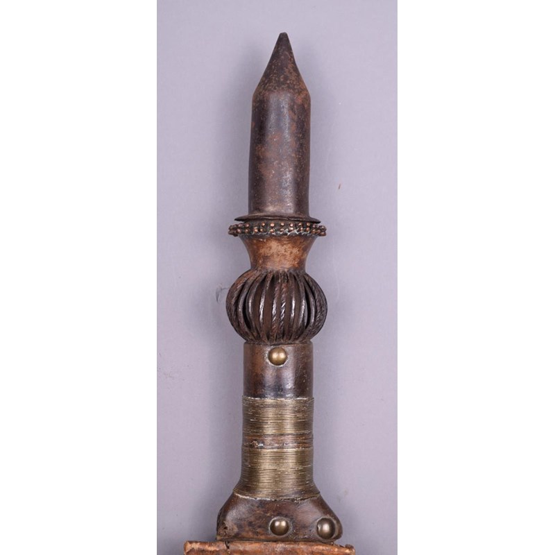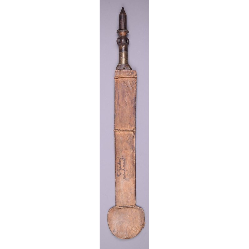 with a dot and line decorated blade and a brass wire bound leather grip with brass studs and an open wirework sphere and copper spike to an iron pommel, with a vellum covered scabbard indistinctly inscribed,