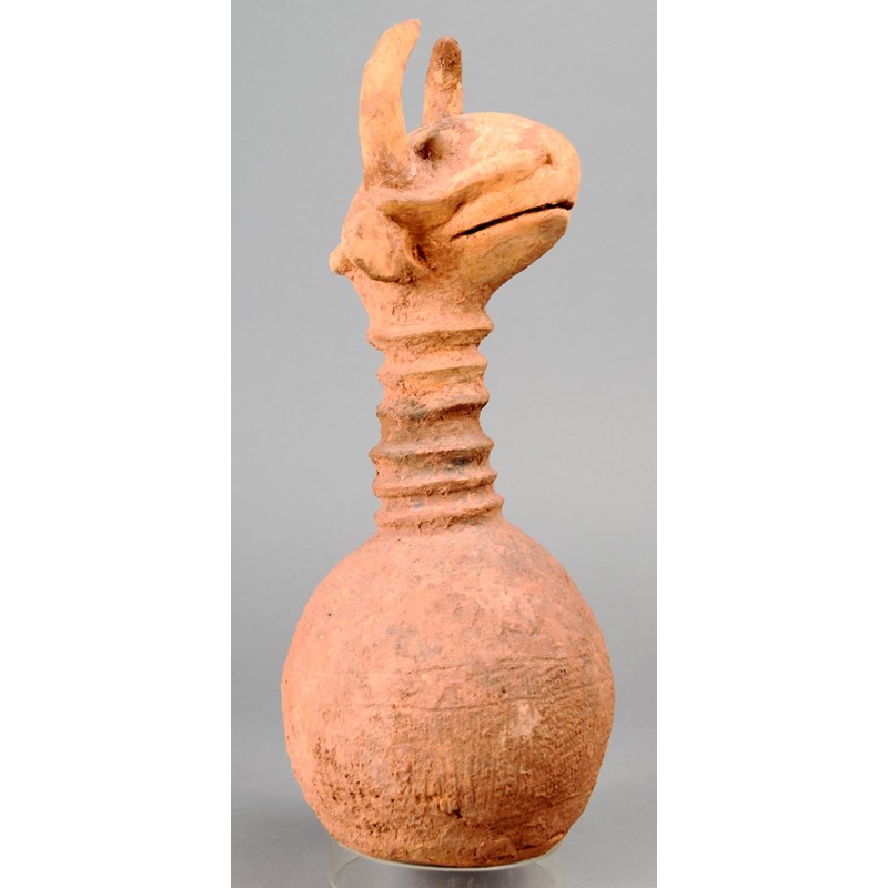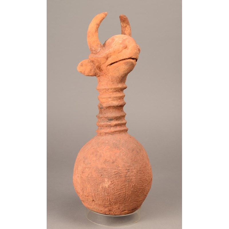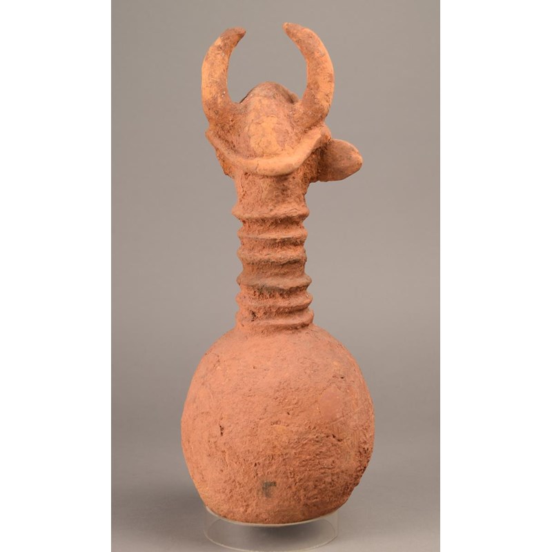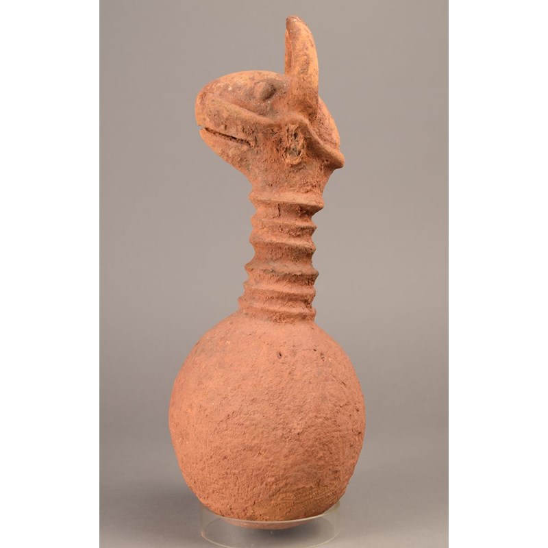 terracotta, with a bulbous body having geometric decoration with a ringed neck and antelope head,