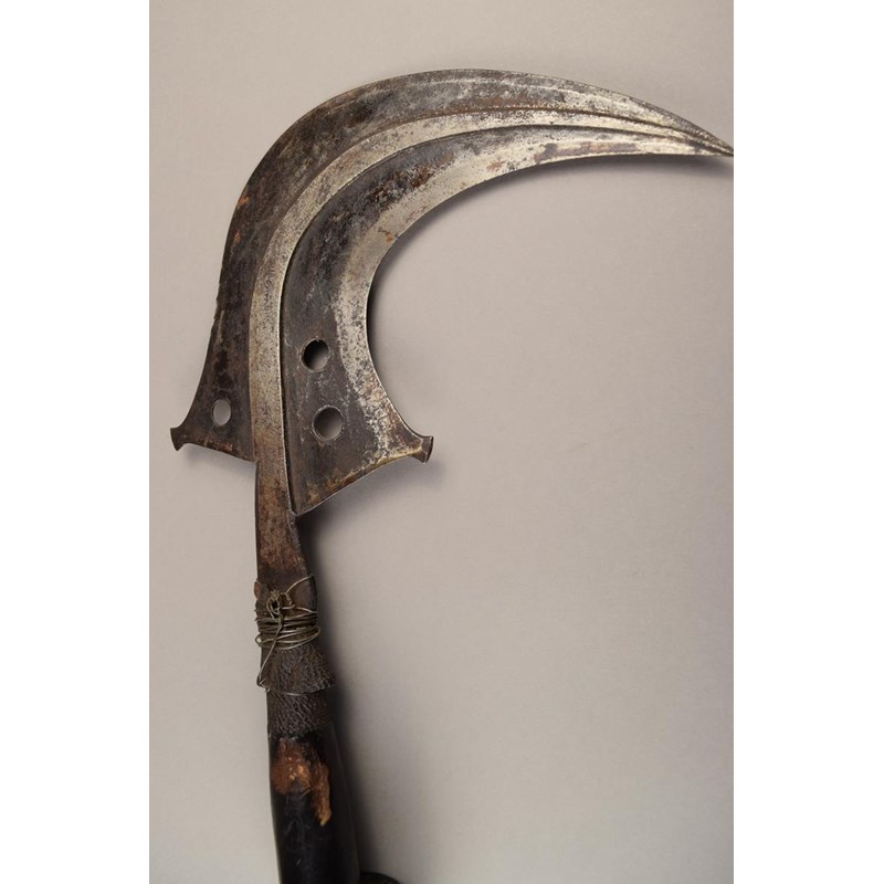 iron and wood, with a curved ridged blade with three holes and with a part stipple decorated handle,