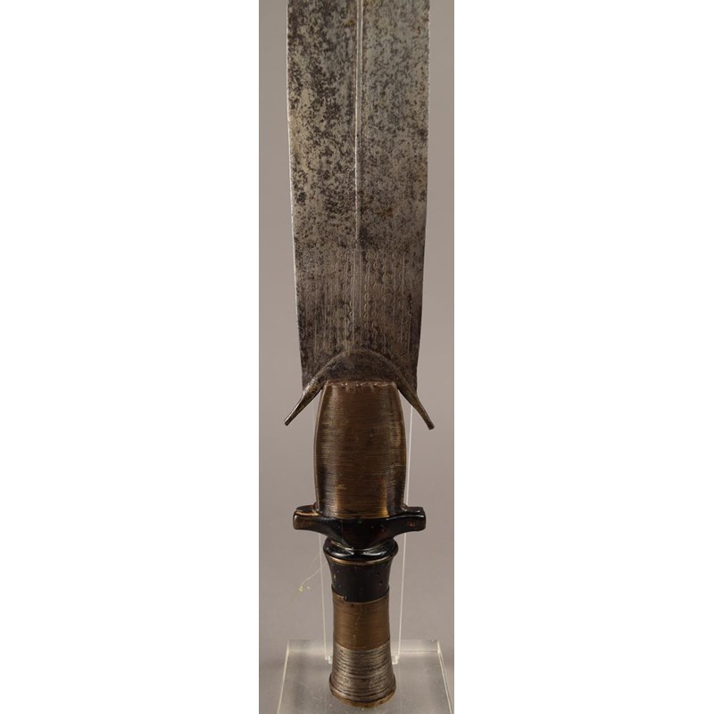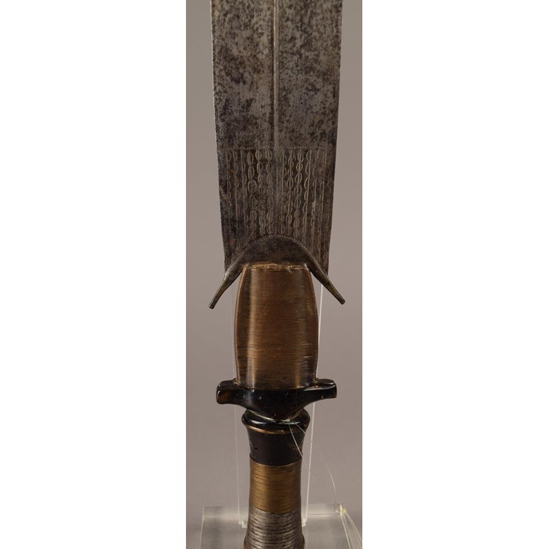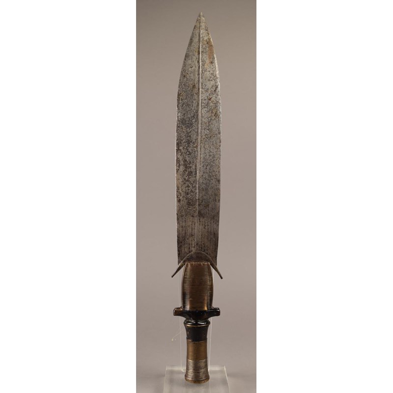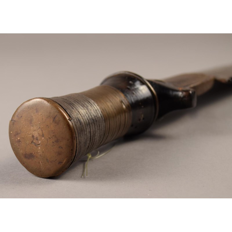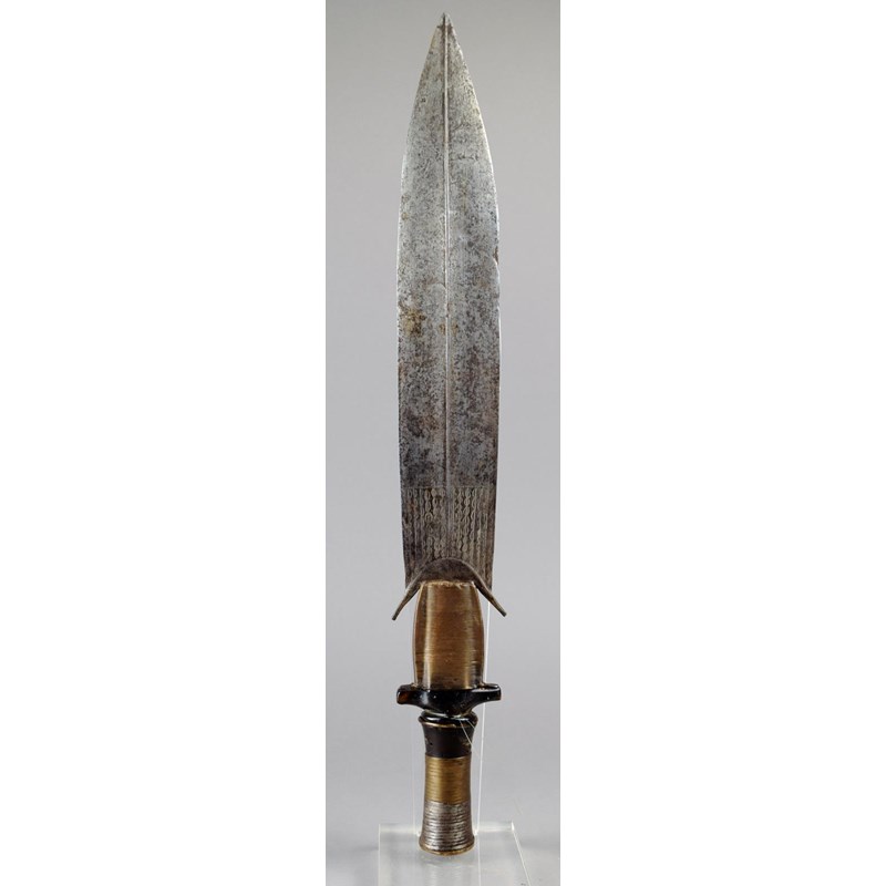 steel, wood and brass, the leaf shape blade with a medial ridge and incised eliptical decoration,