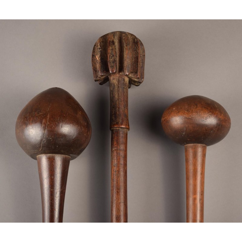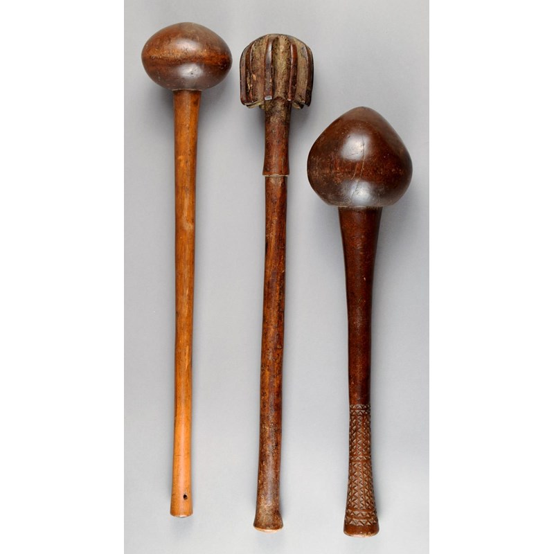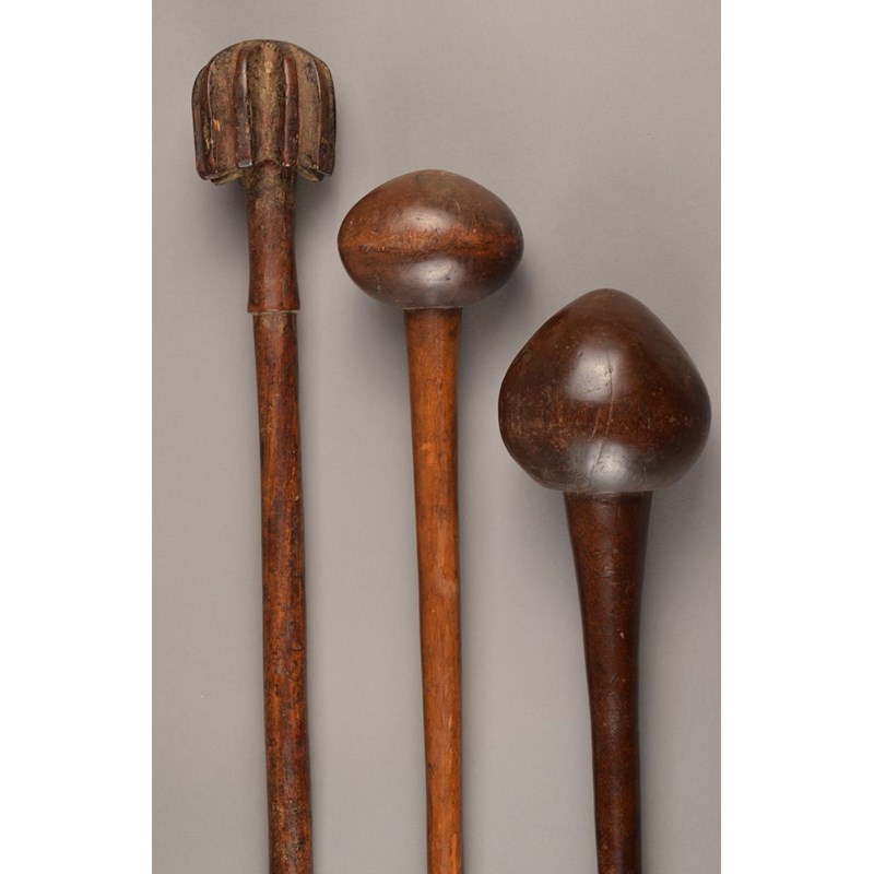 a Zulu knobkerrie, with a compressed spherical head and a Zulu butter churner, with a ribbed head. (3)