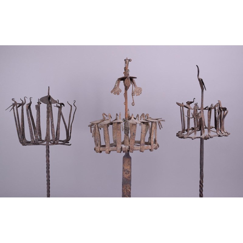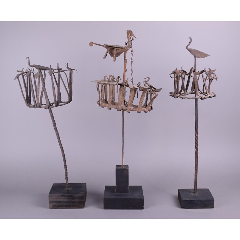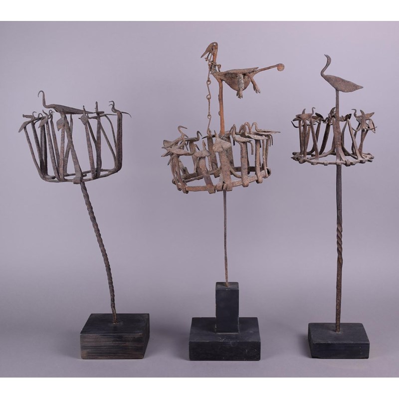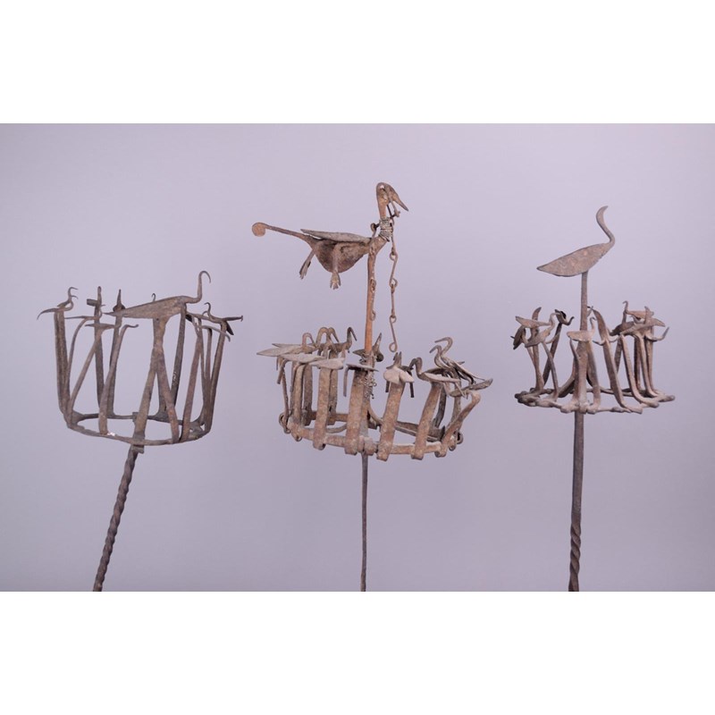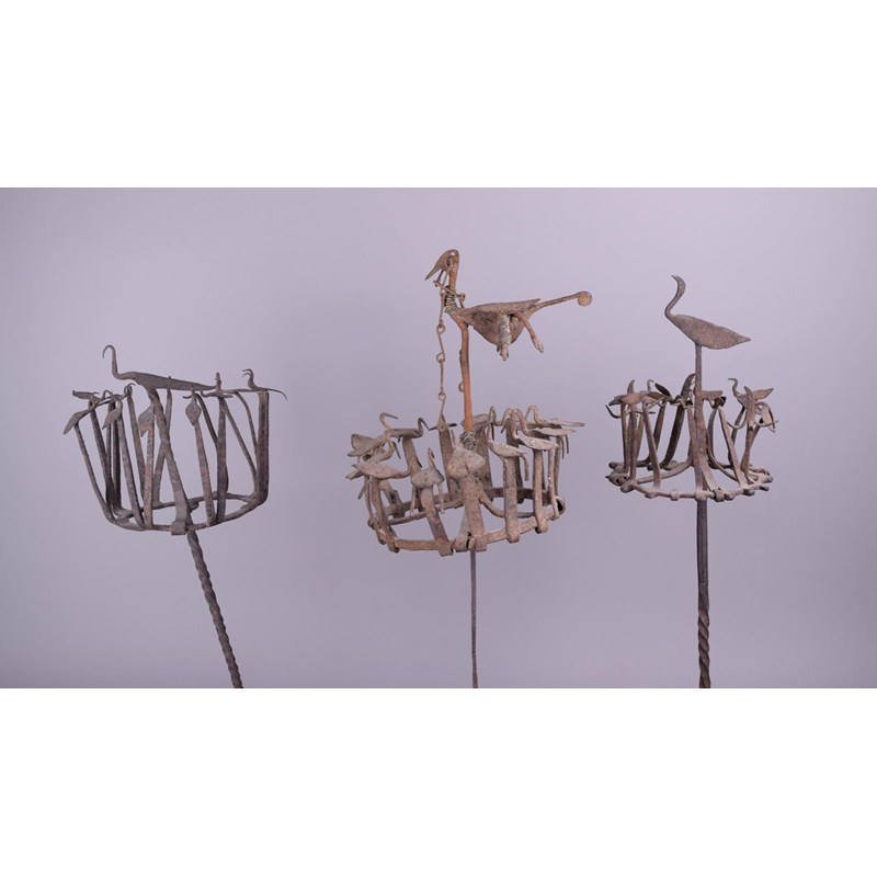 Three Yoruba Osanyin staffs Nigeria iron with crowns of birds