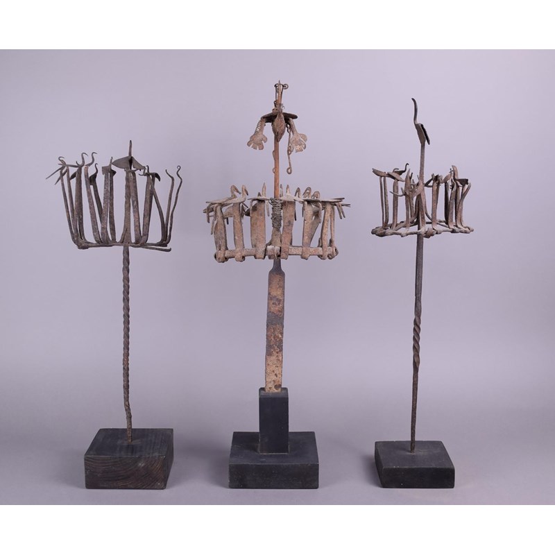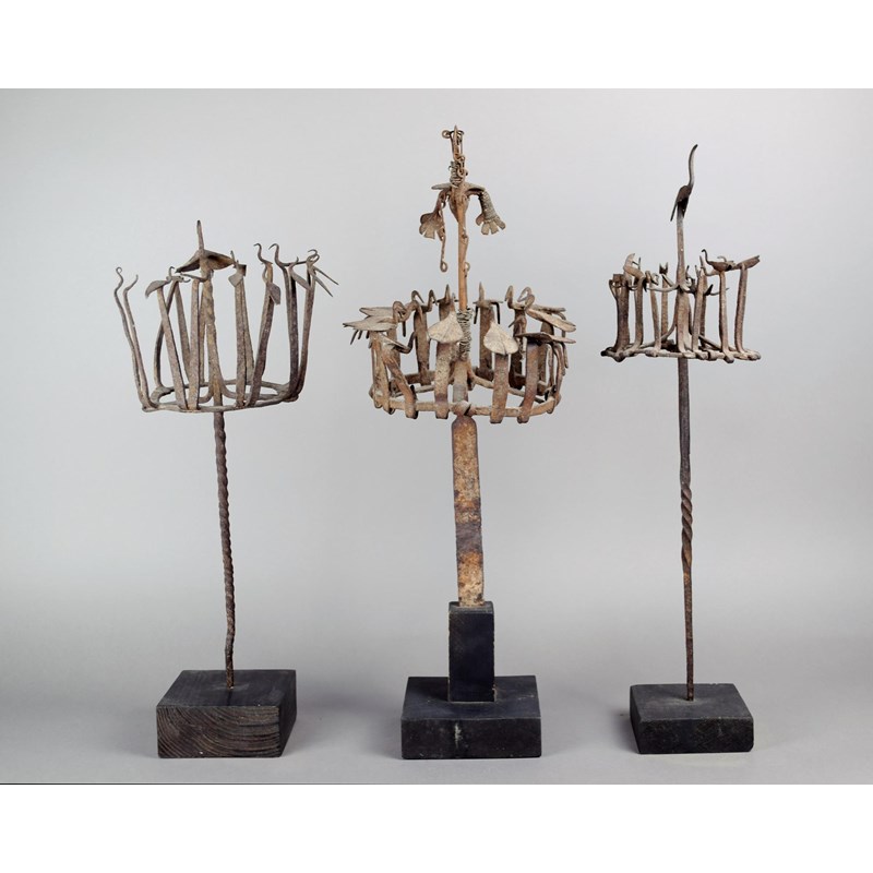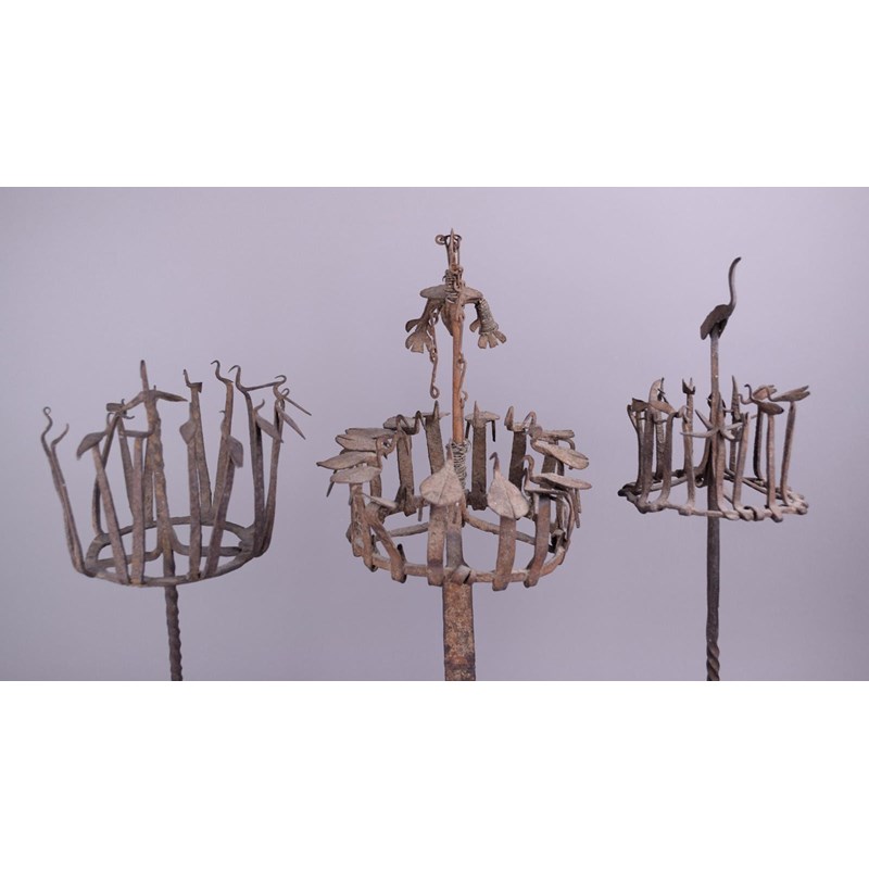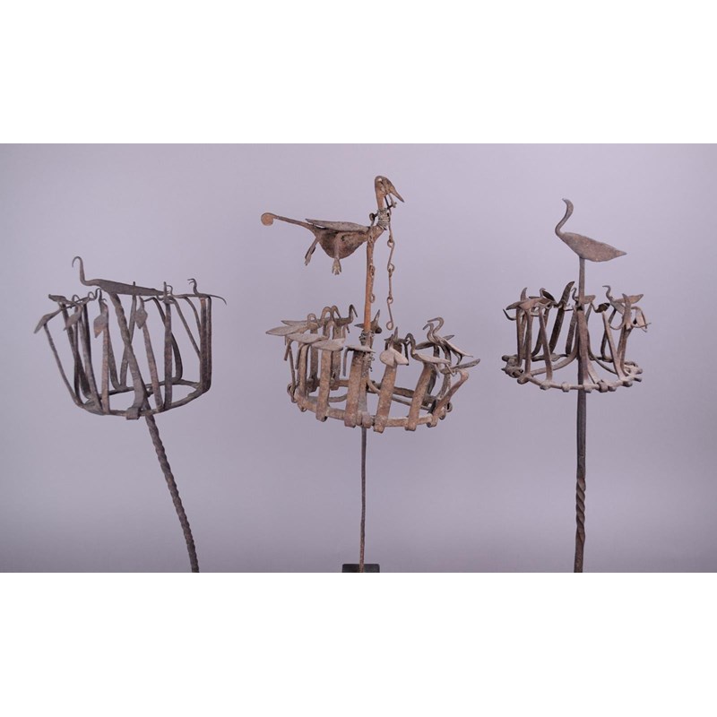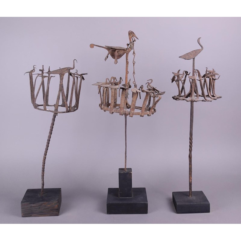 Three Yoruba Osanyin staffs Nigeria iron with crowns of birds