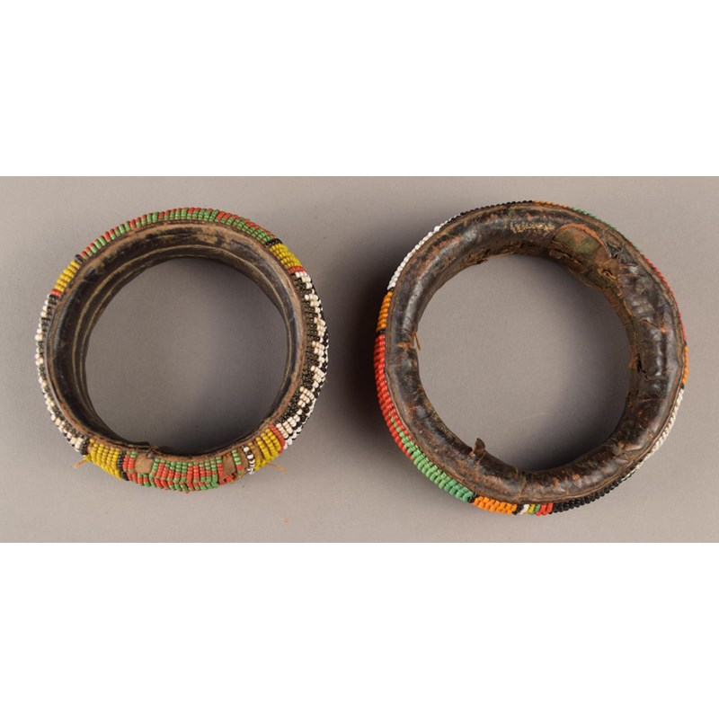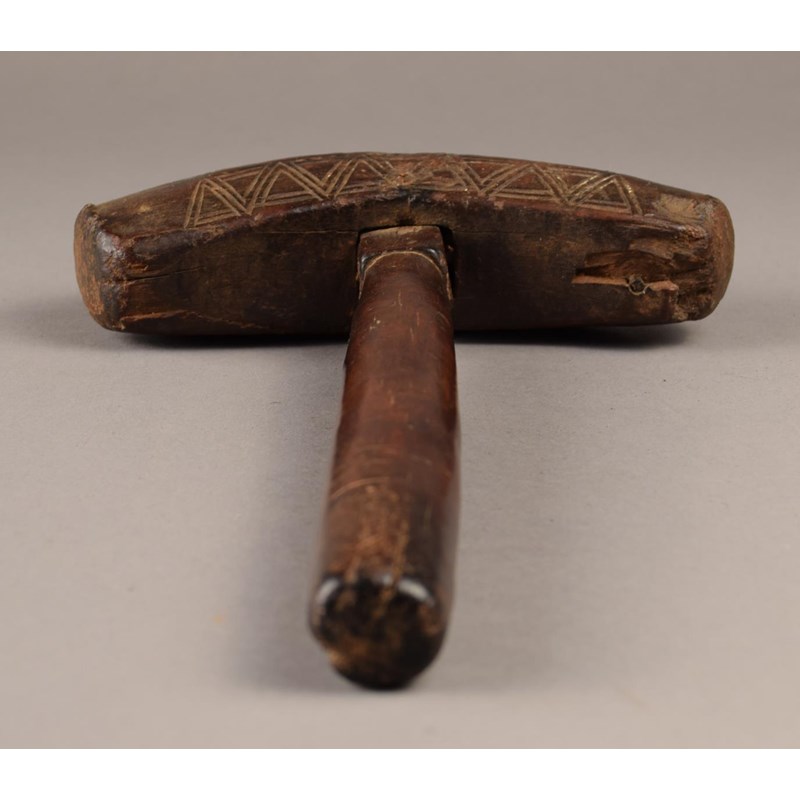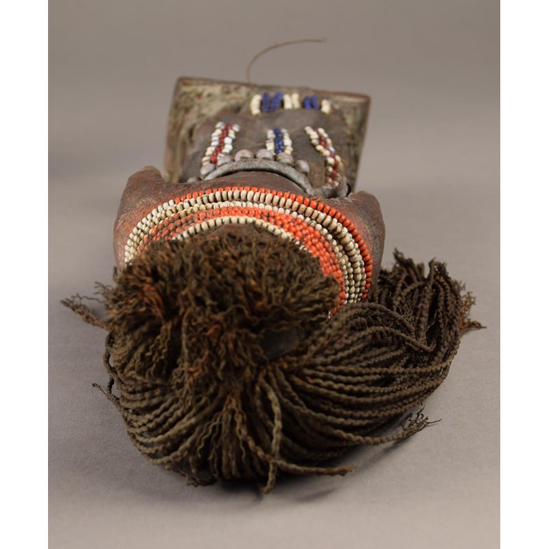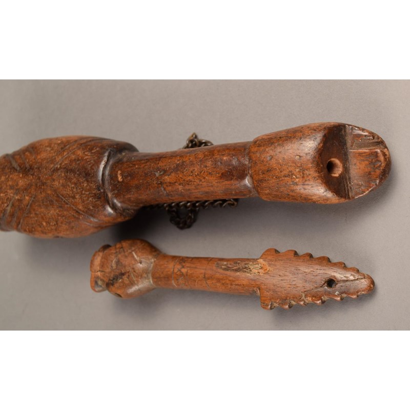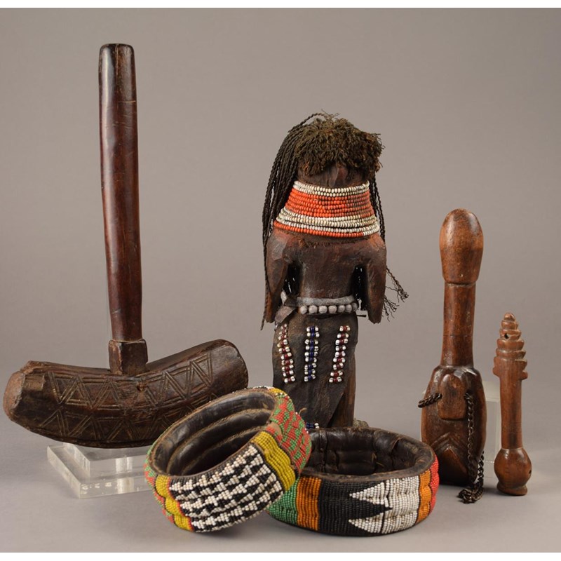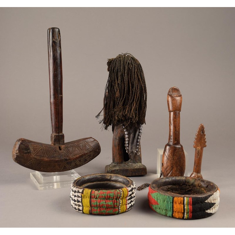 two Mossi whistles, one with a chain, a doll with beadwork and fibre hair and a West African sceptre shape beater. (6)