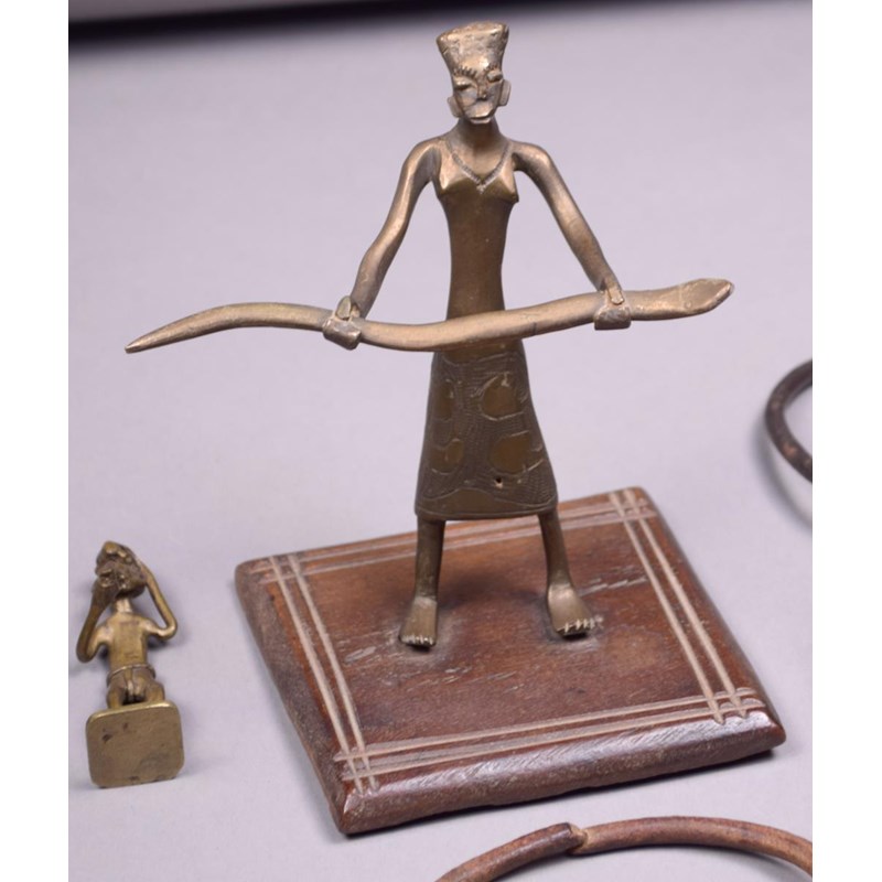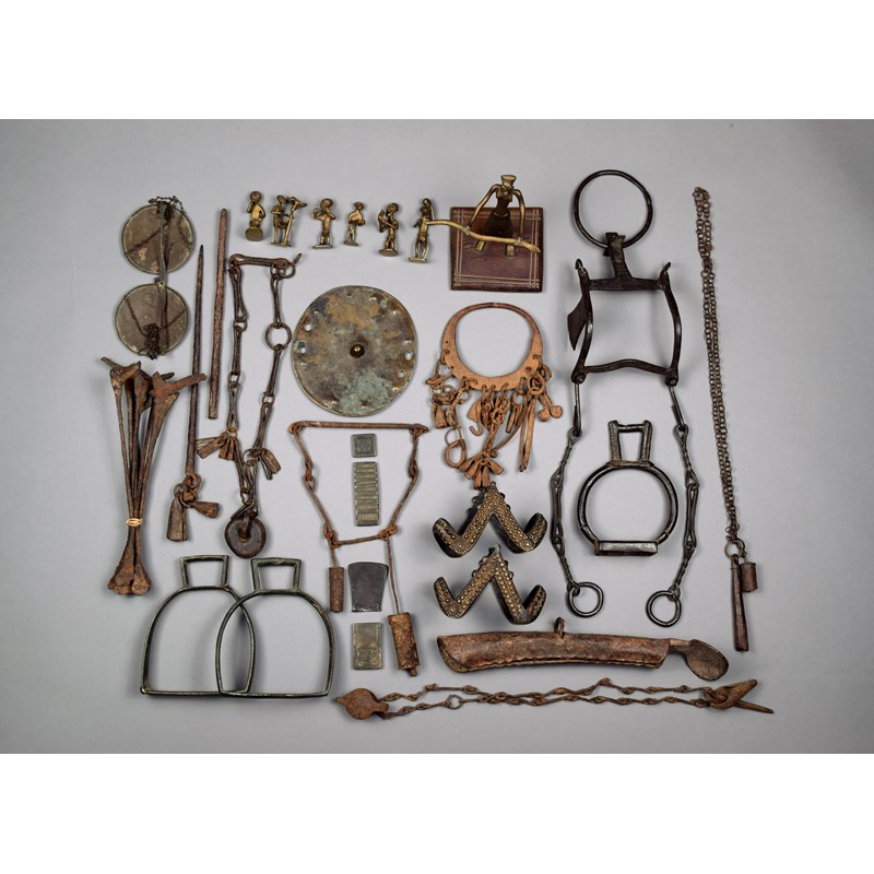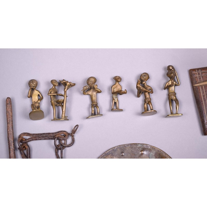 four similar chains, seven Liberian iron Buji currency, a West African horse ring bit, a Nigerian currency hoe, a rod with two bells, a pair of brass anklets, a pair of brass stirrups, a single stirrup, a Dahomey brass figure holding a serpent, six Akan brass figures, three brass weights, a set of brass scales and an oval brass pendant with a central boss. (34)