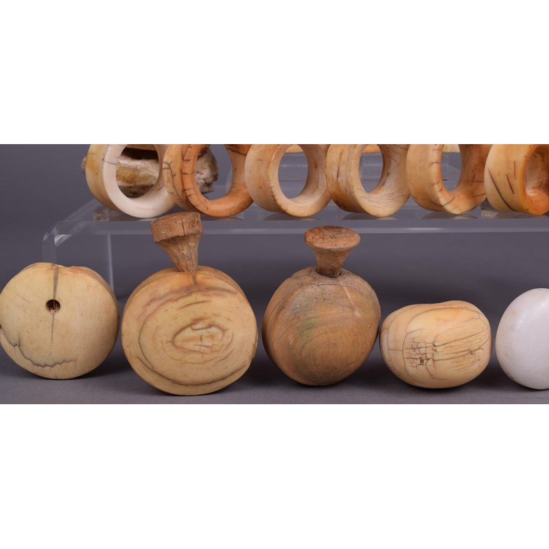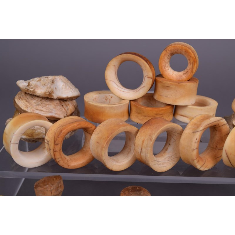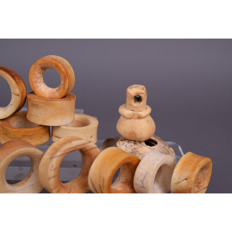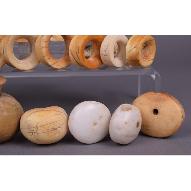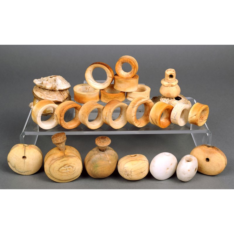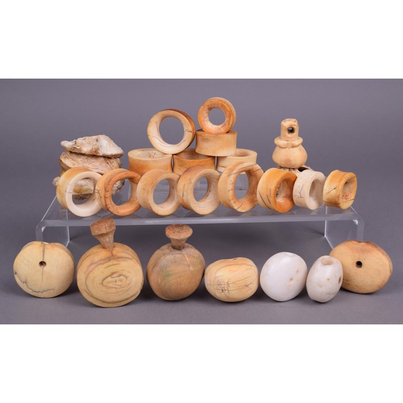 four ivory and two stone lip plugs and a wood stopper, a bone pendant and a collection of fourteen ivory ear ornaments and five vertebrae discs. (29)