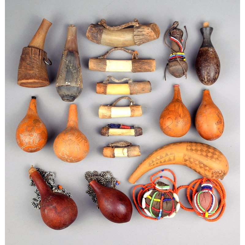 six Masaai double ended, bone, horn and hide, three further gourds, three further horn and a wood container with inlaid metal pins, and two Masaai neck charms, cloth and beads, one with cowrie shells. (19)
