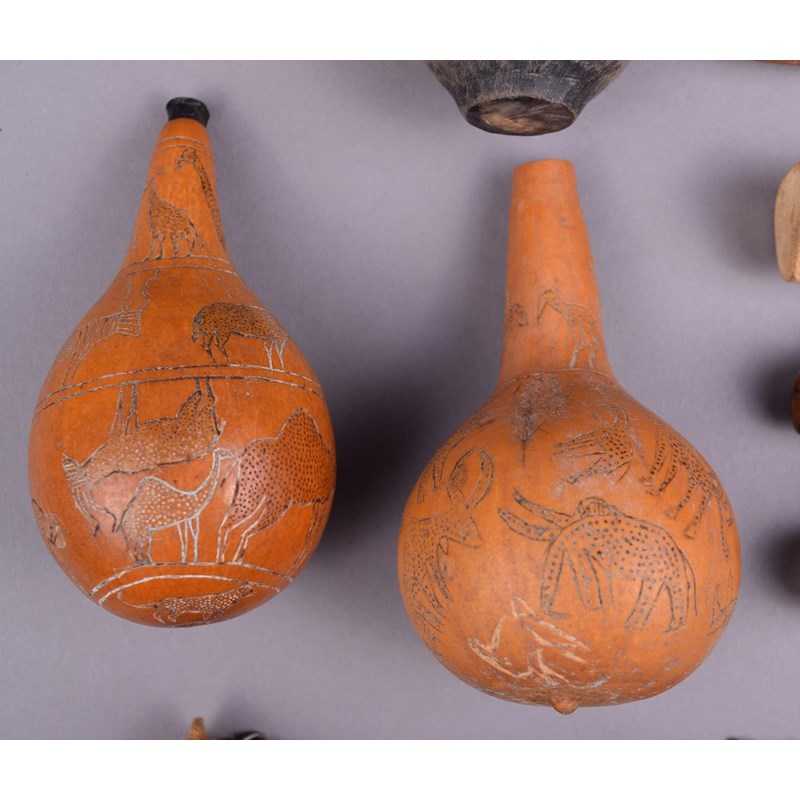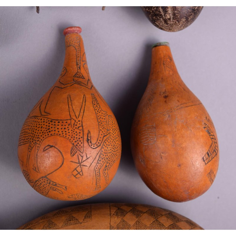 including four Turkana gourds, decorated animals, figures and symbols, three with stoppers,