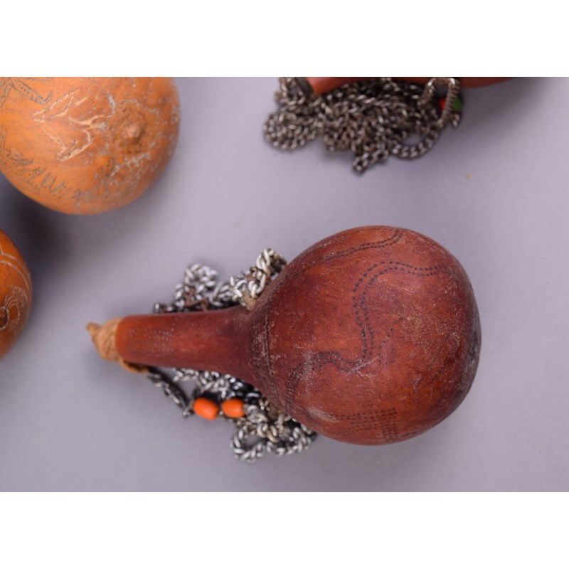 A small collection of snuff and medicine containers Kenya including four Turkana gourds