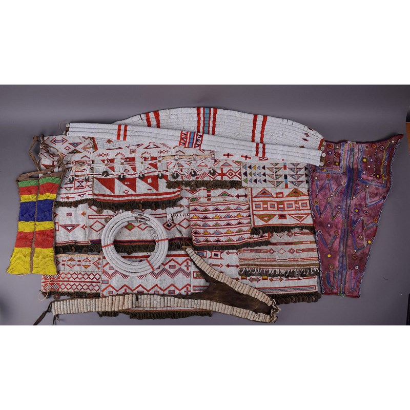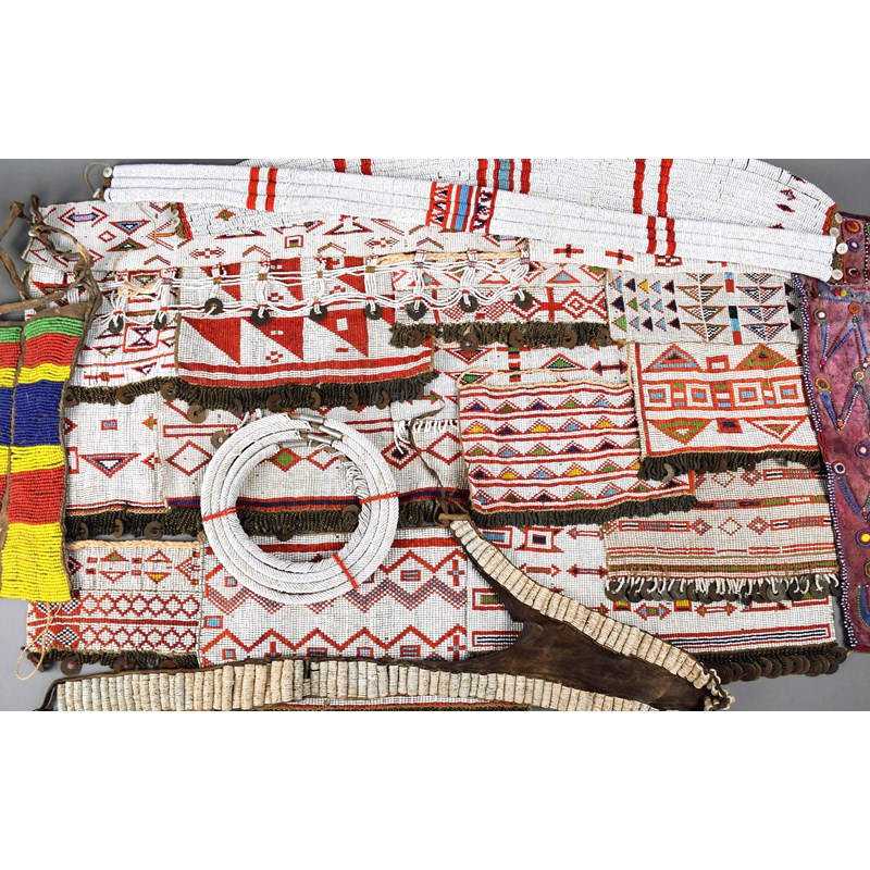 two coil waistbands, a neckband, an armband, a panel, a Turkana leather and shell cache-sex and two Masaai aprons. (21)
