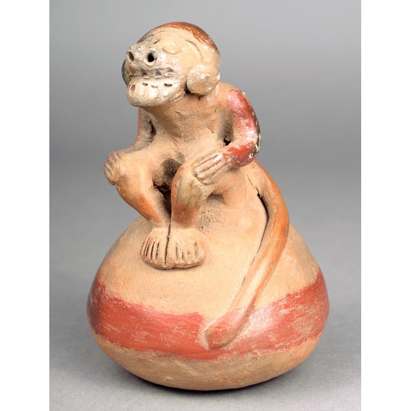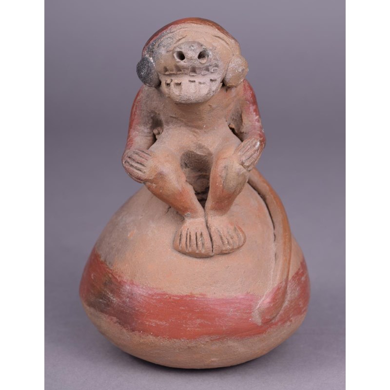 pottery with pigment, the ovoid pot with a hole to the reverse and with a seated monkey wearing a headdress,