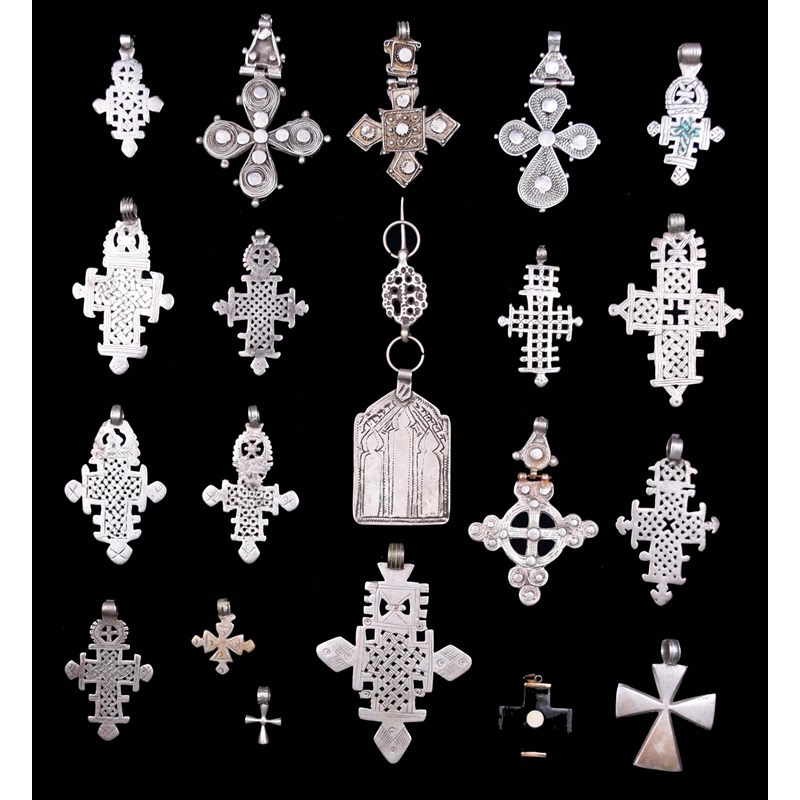 ‡ Eighteen Ethiopian Coptic cross pendants silver coloured metal