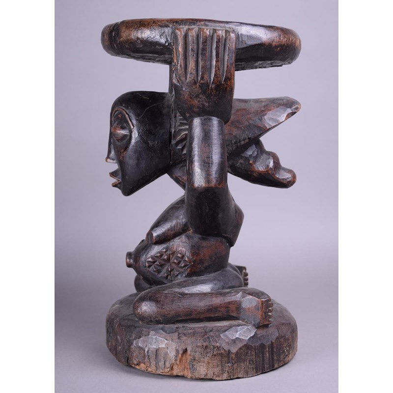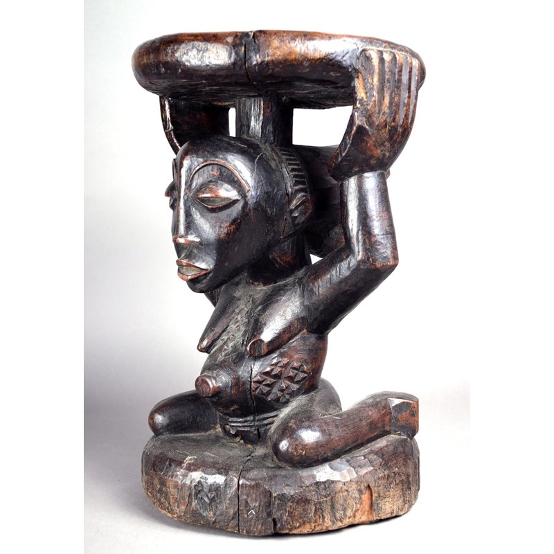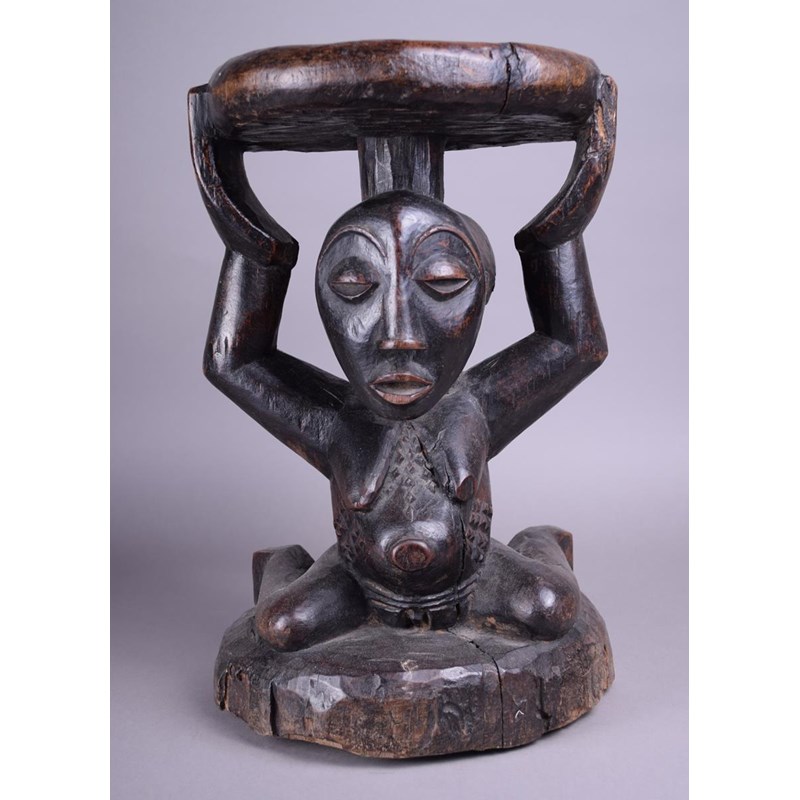 wood, the female support with body scarifications and pointed coiffure, with raised arms to a circular seat,