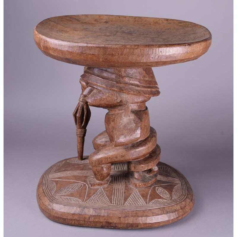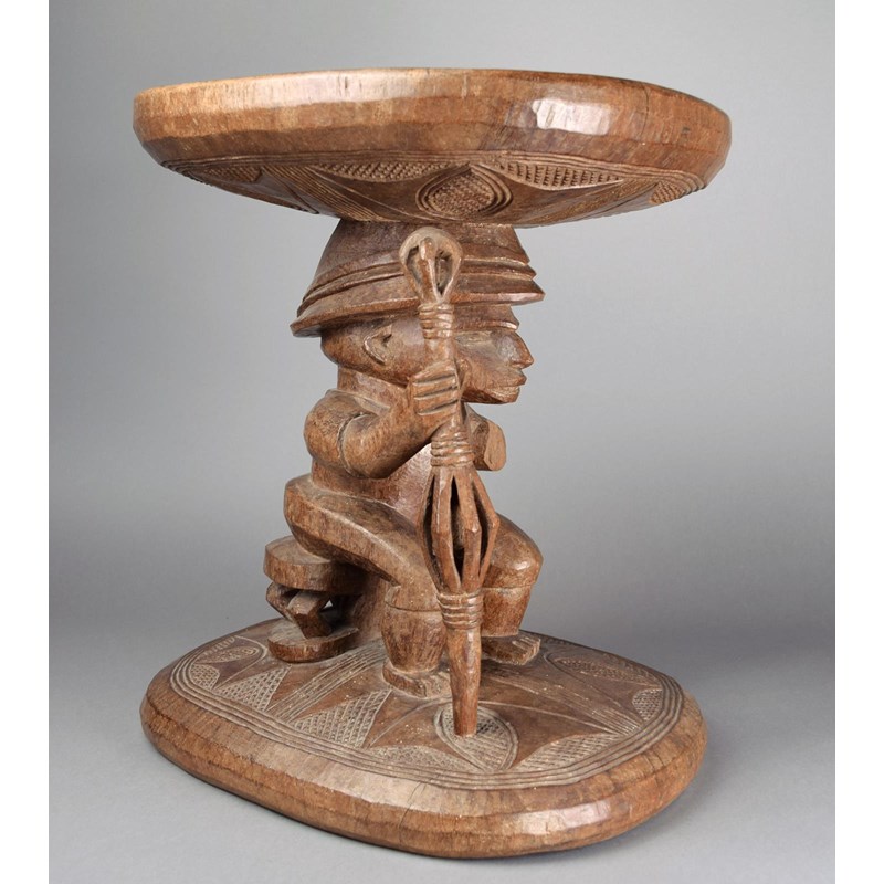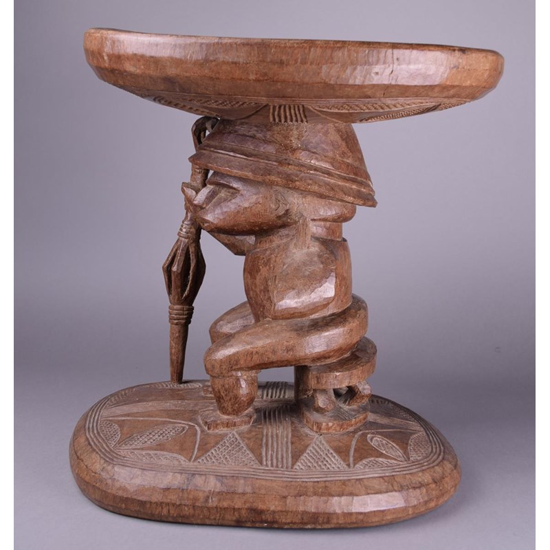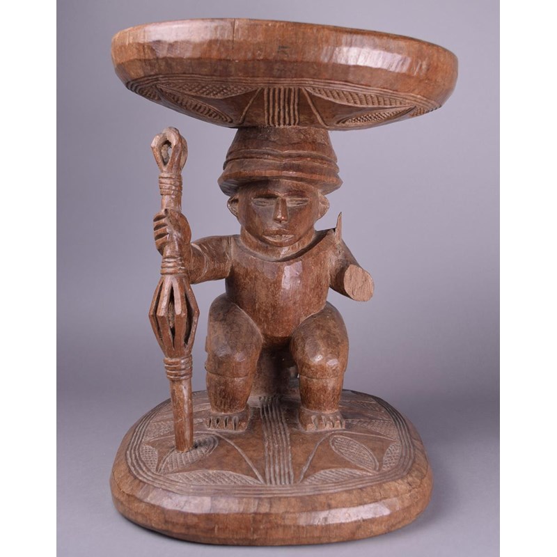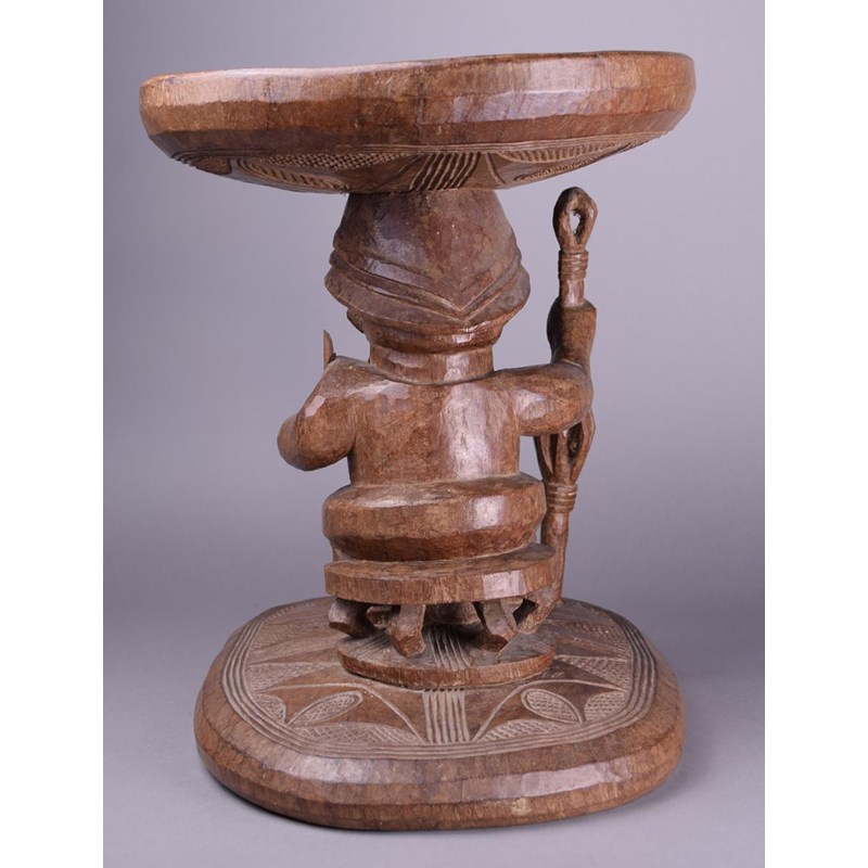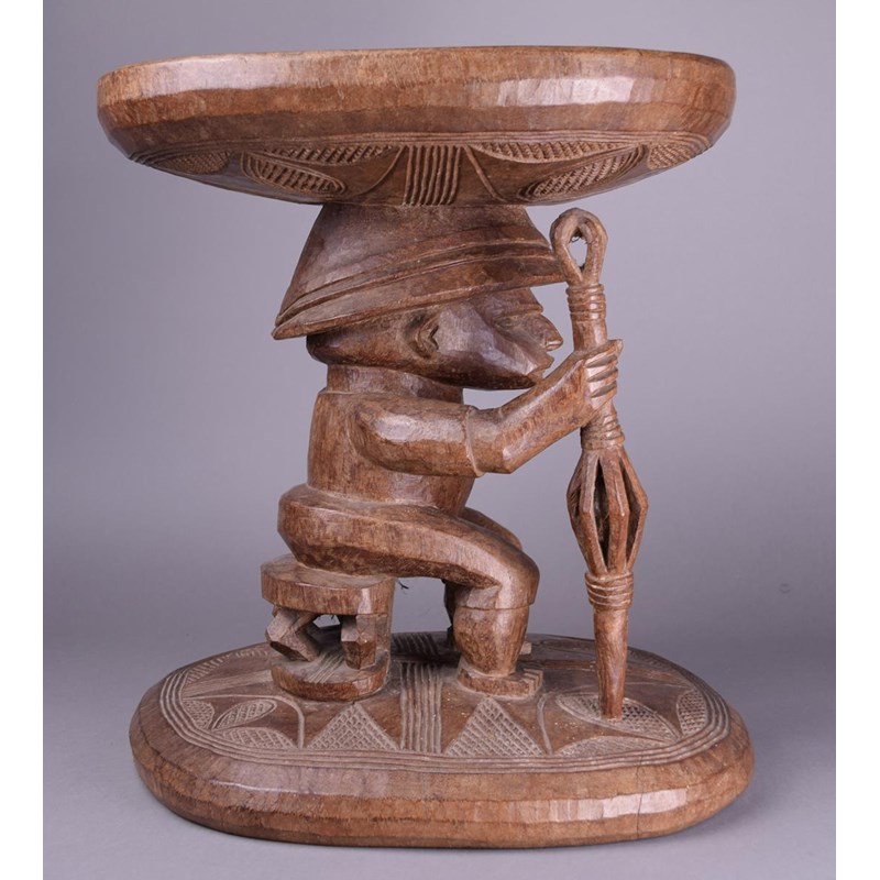 A Yoruba stool Nigeria wood with a seated figure support wearing a pith helmet and holding a...