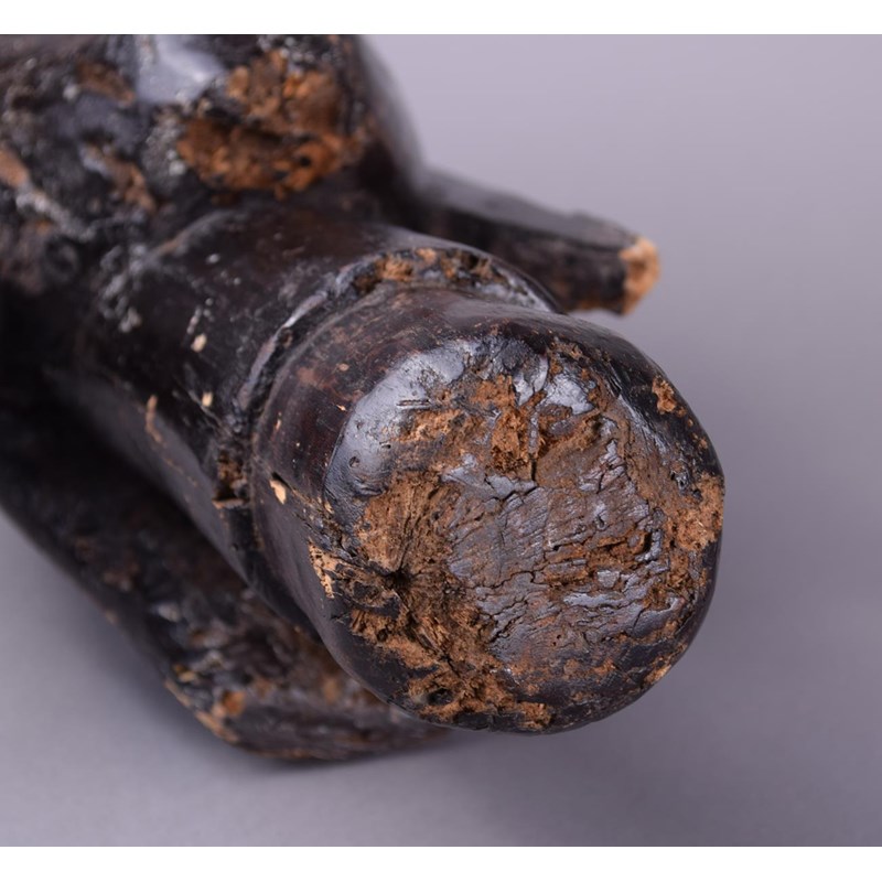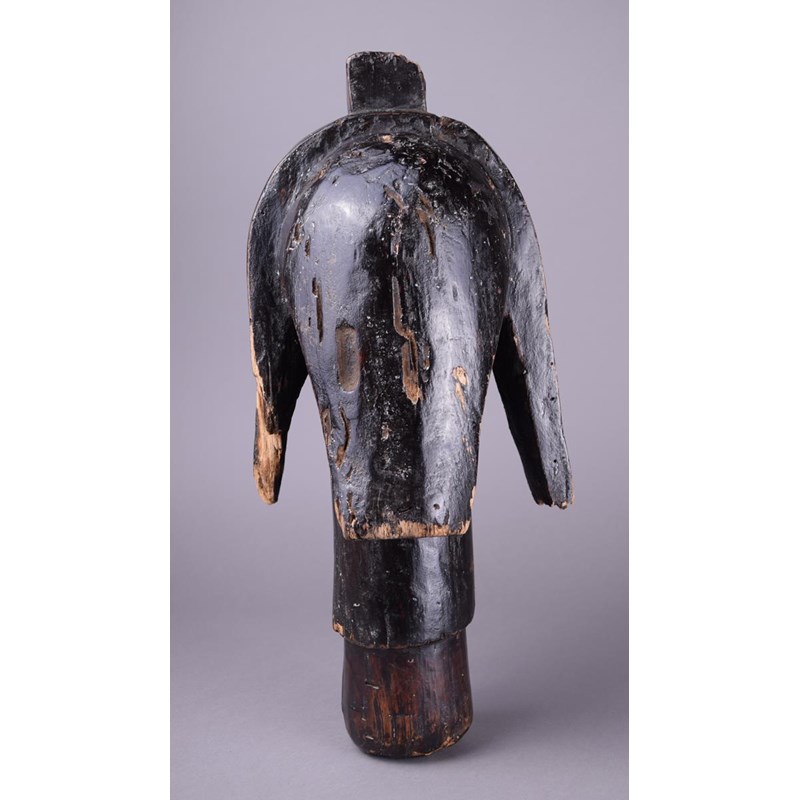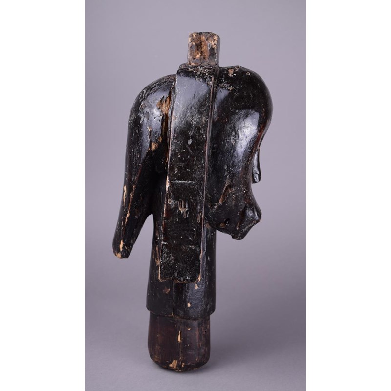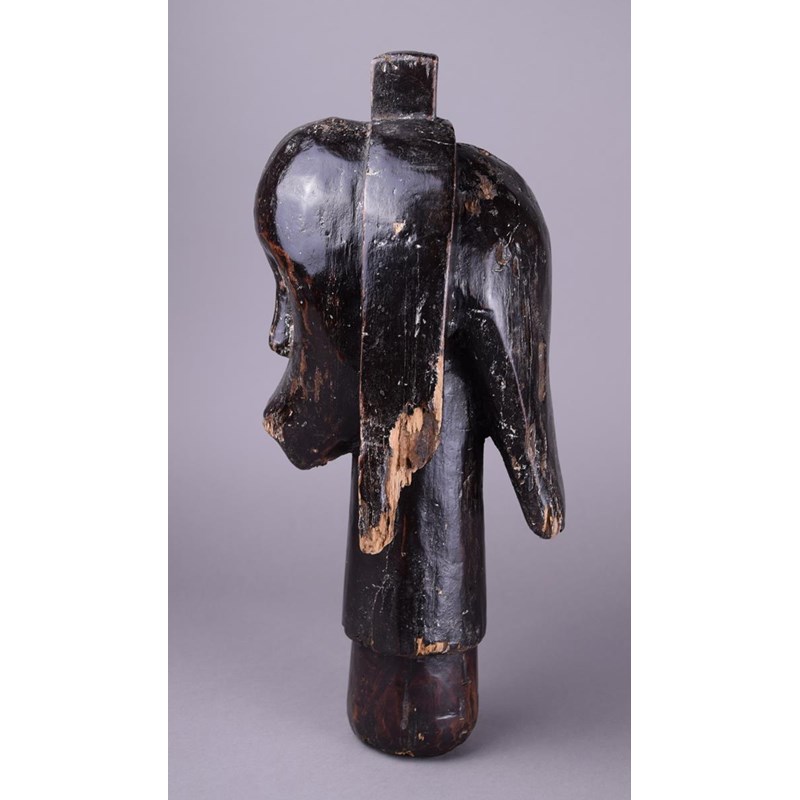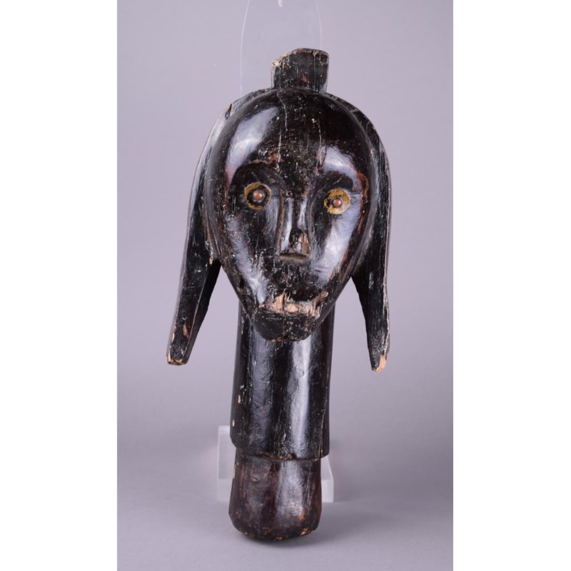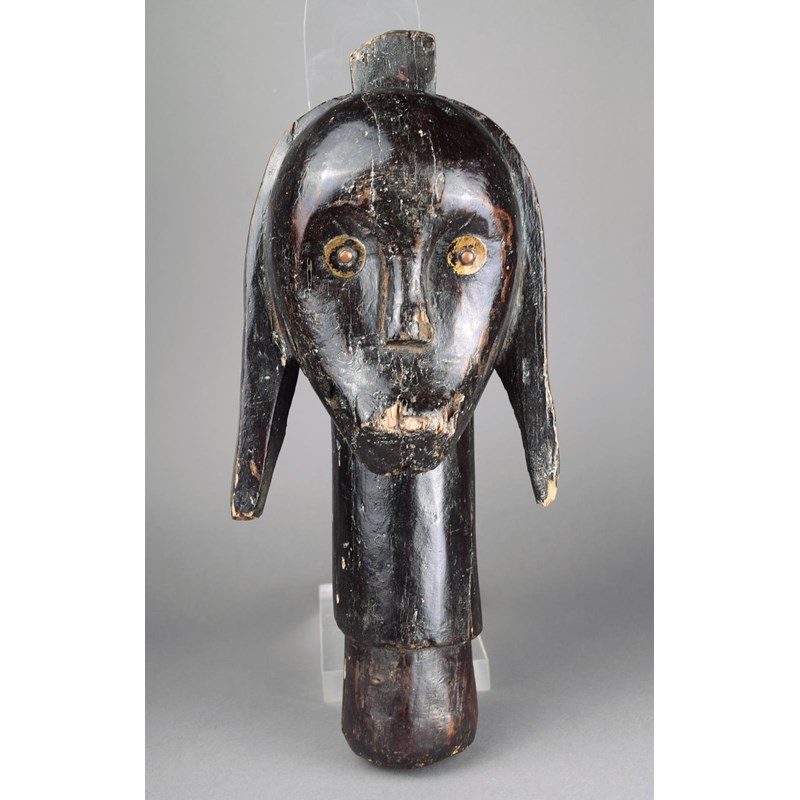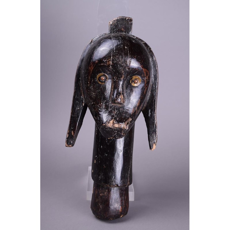 A Fang head Gabon wood with copper pin and brass disc eyes and with a dark patina