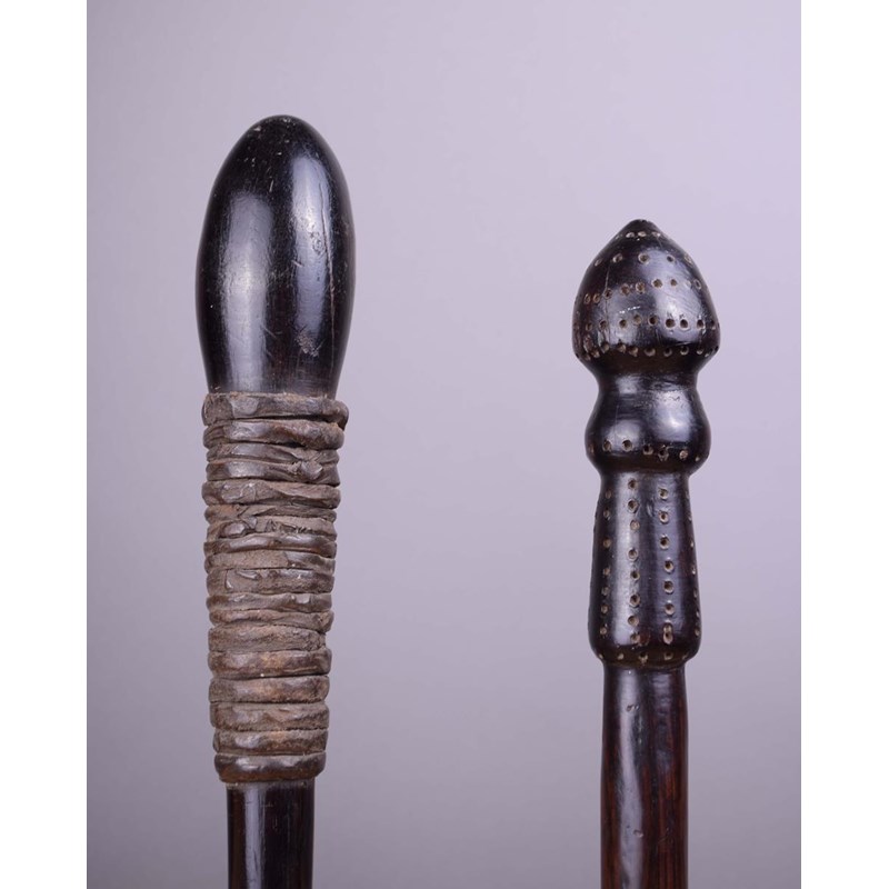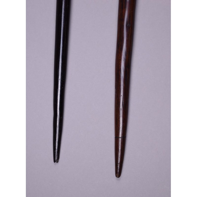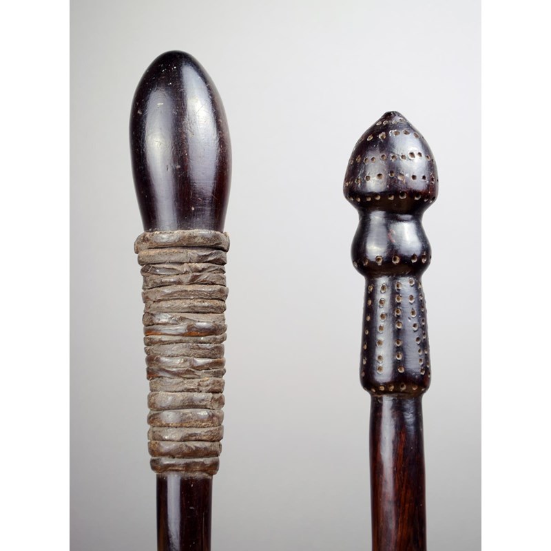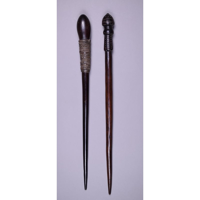 wood, of tapering form, one bound with rings of leather, the other with a stepped terminal with rows of incised dots,