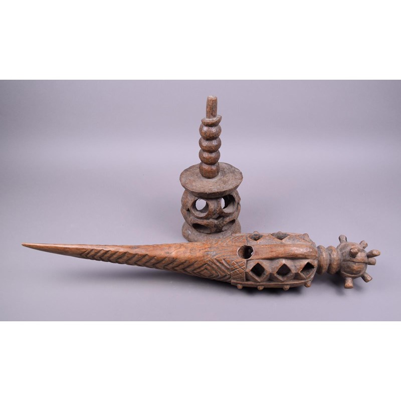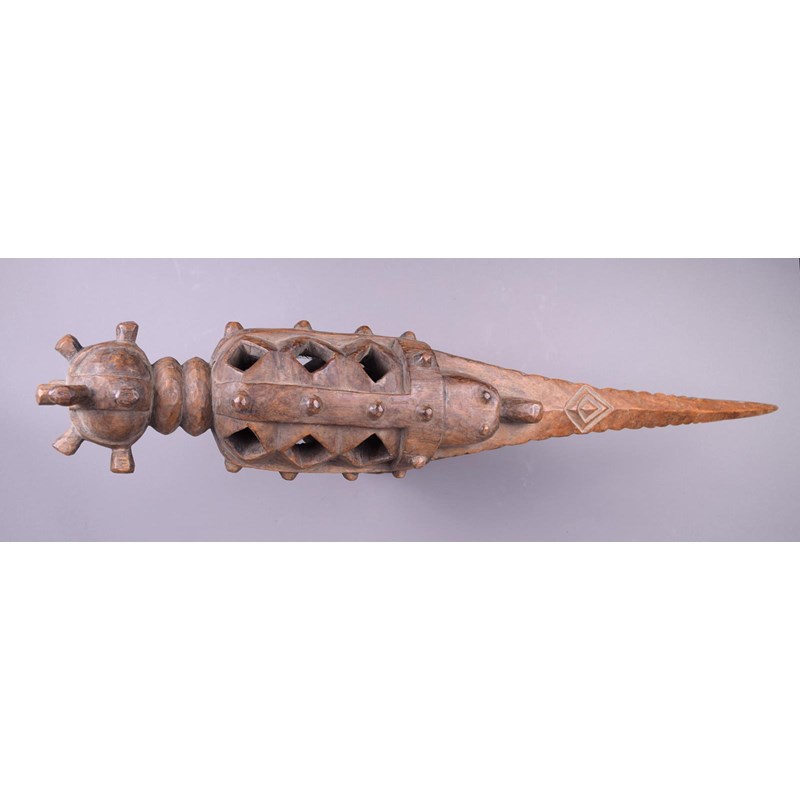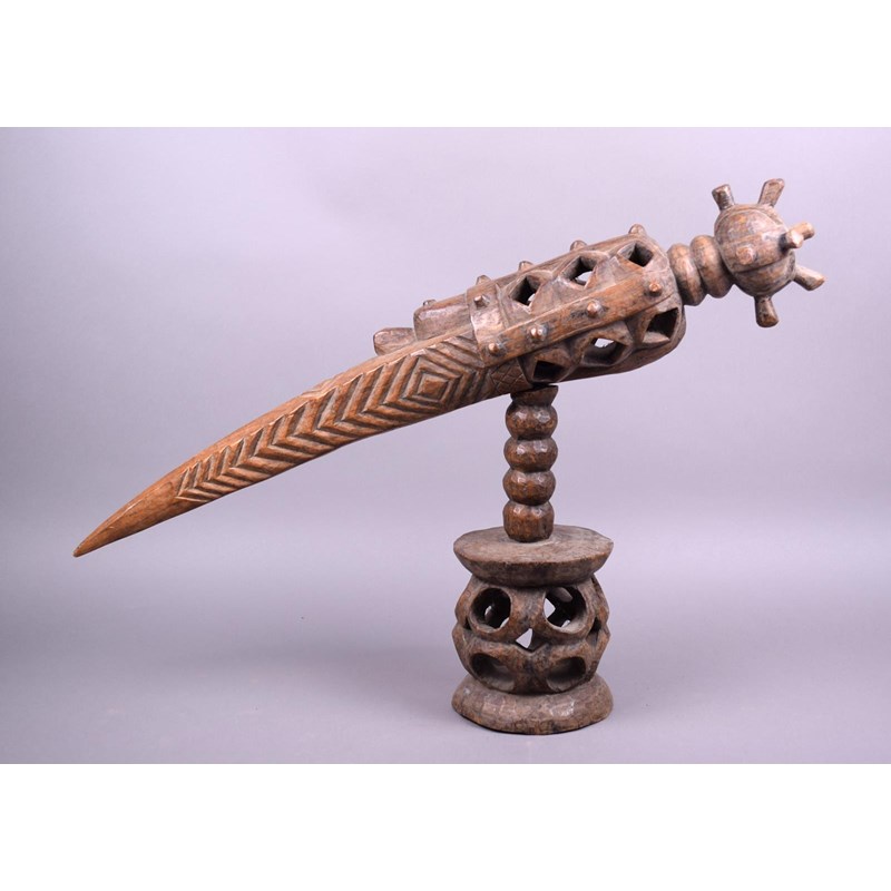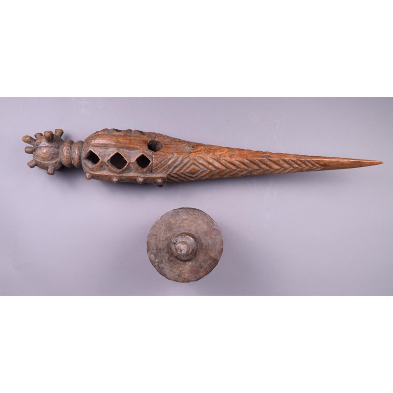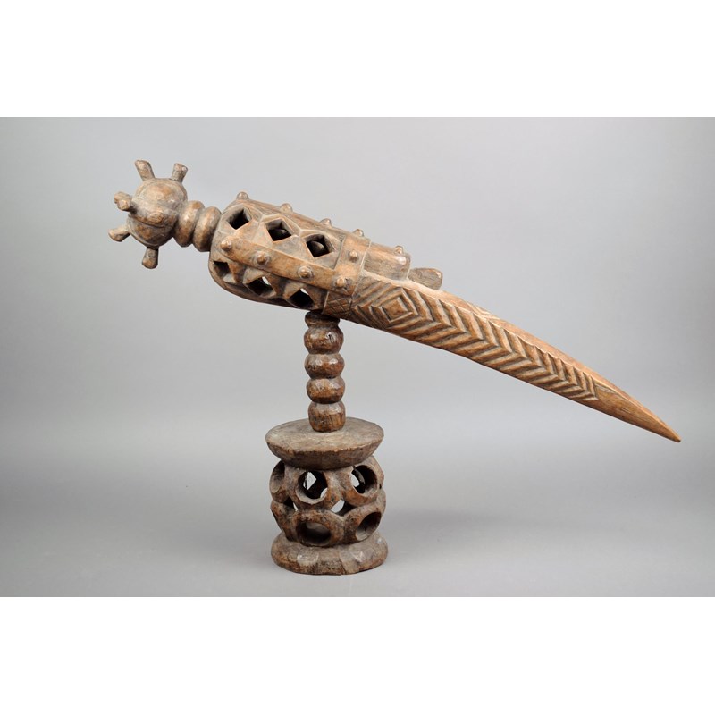 wood, with a pierced bird like head, on a knoped and pierced stand, stamped C.A.J. BISSAU,