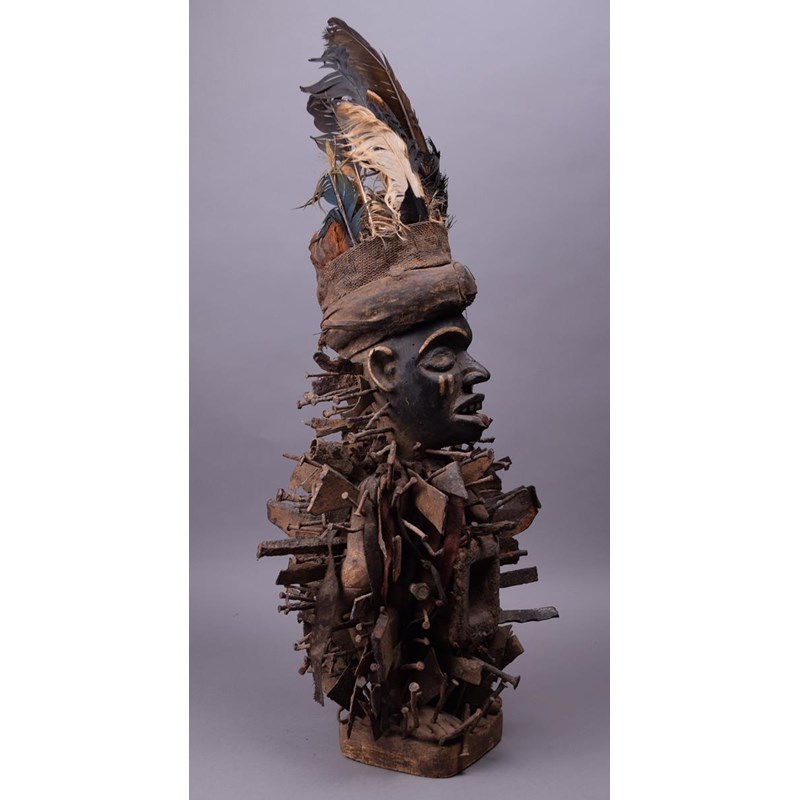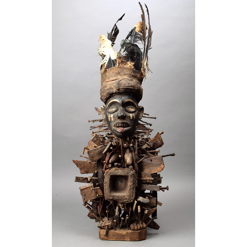 wood, metal, mirror, cloth, fibre, feathers and paint, with her arms behind and tongue sticking out,