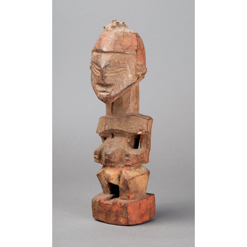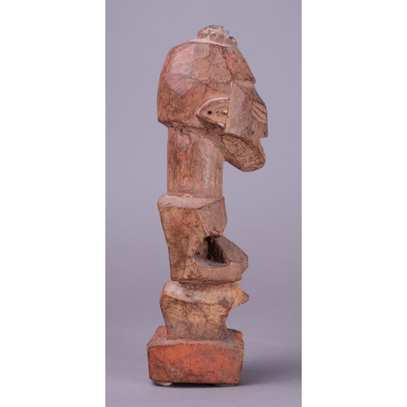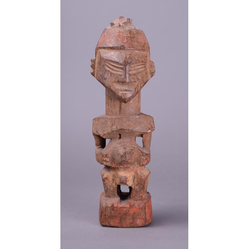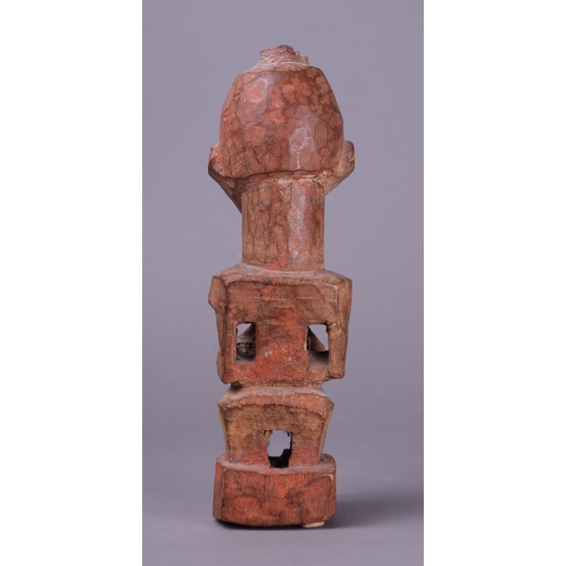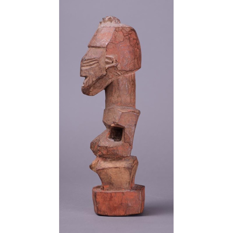 wood with charge to the top of the head and with a red ochre and encrusted patina,