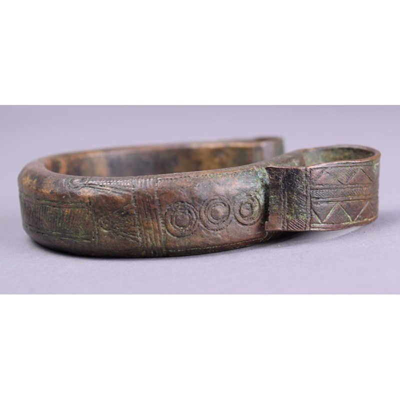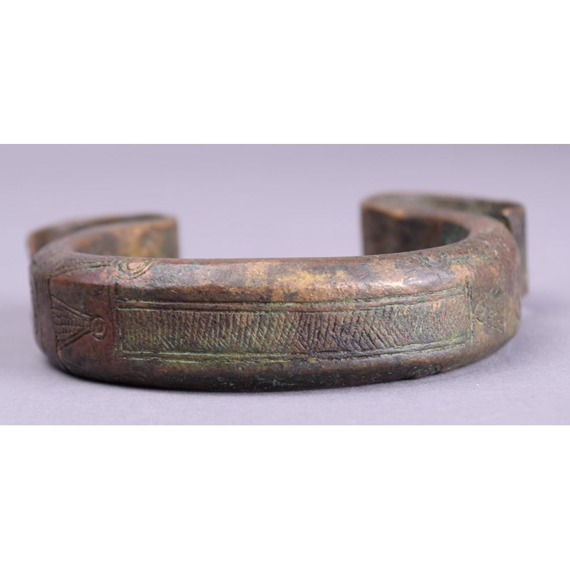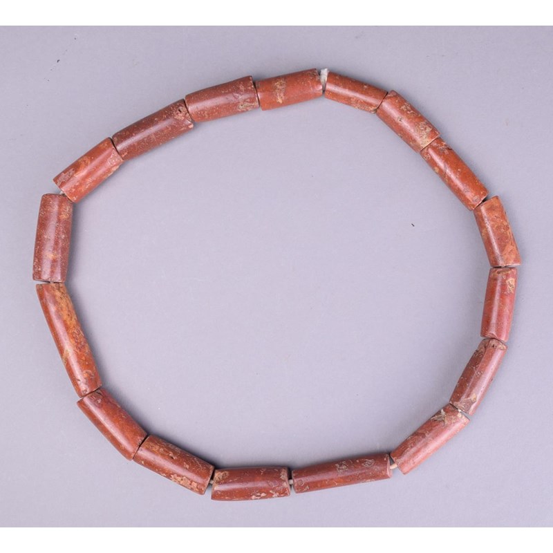 a hardstone bead necklace and a brass currency bangle, with incised decoration. (3)