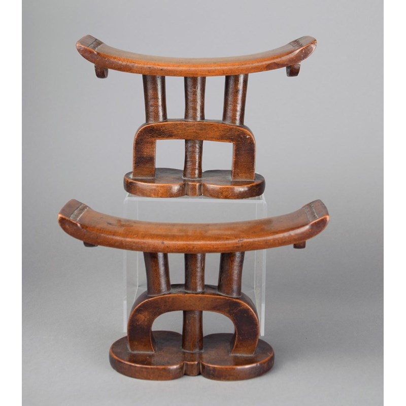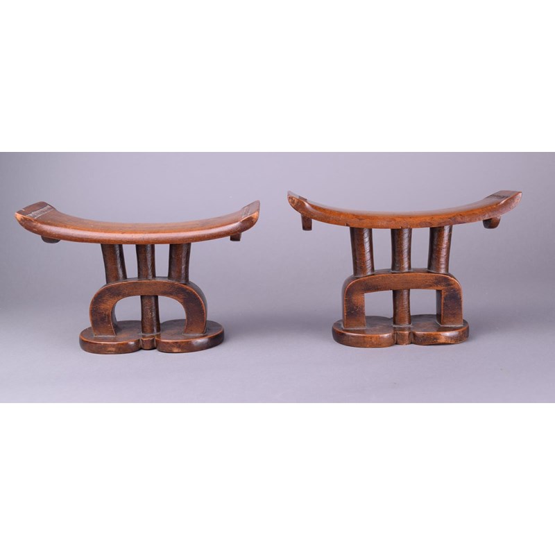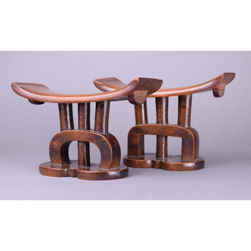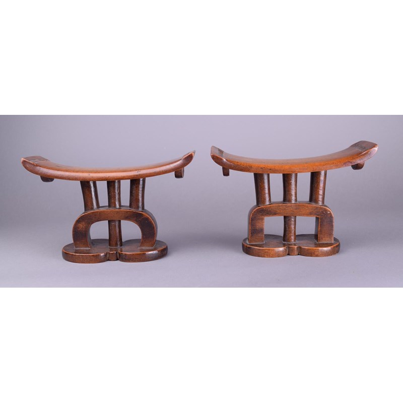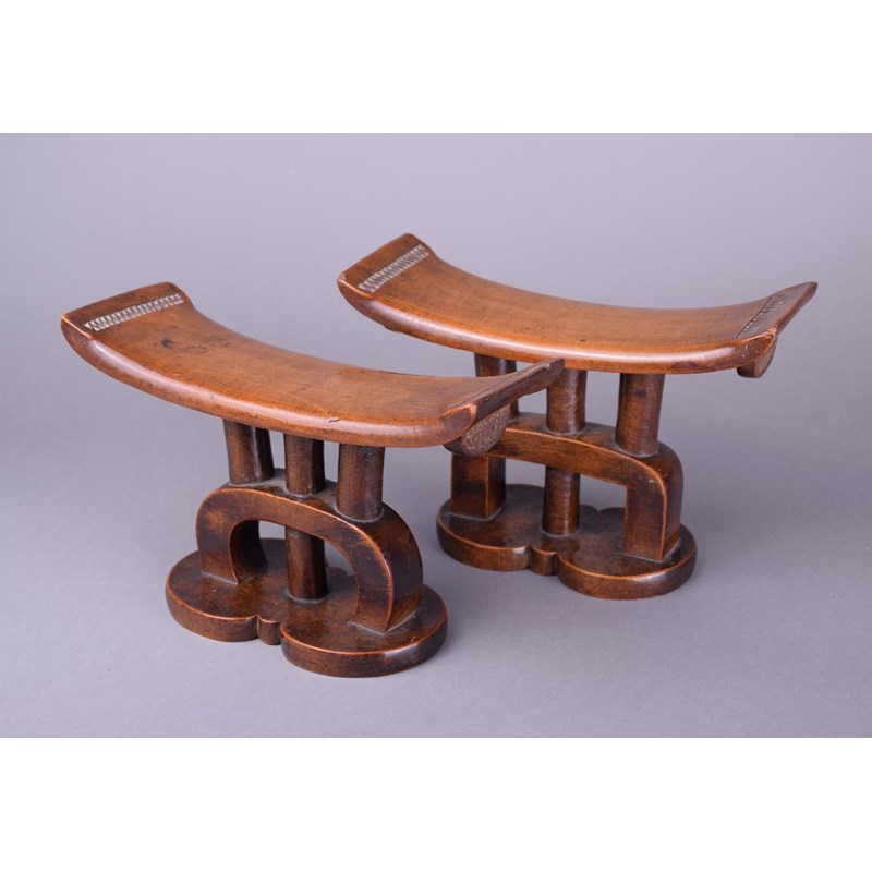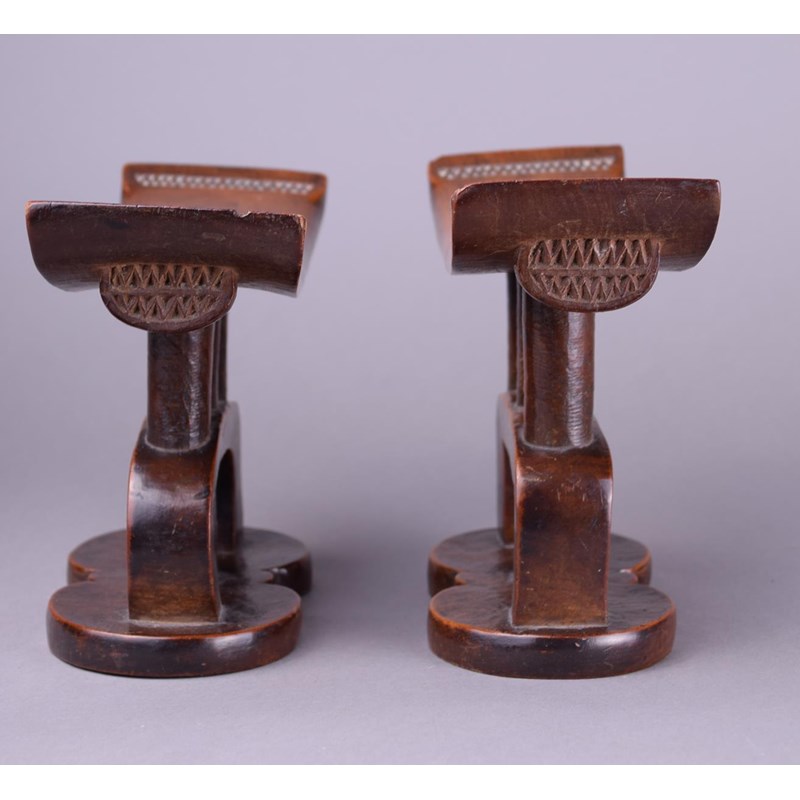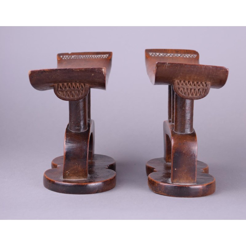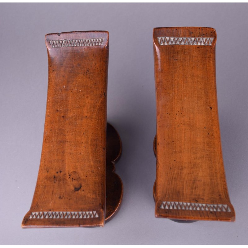 A pair of Tsonga headrests Mozambique wood with carved zig-zag bands to the top end edges and...