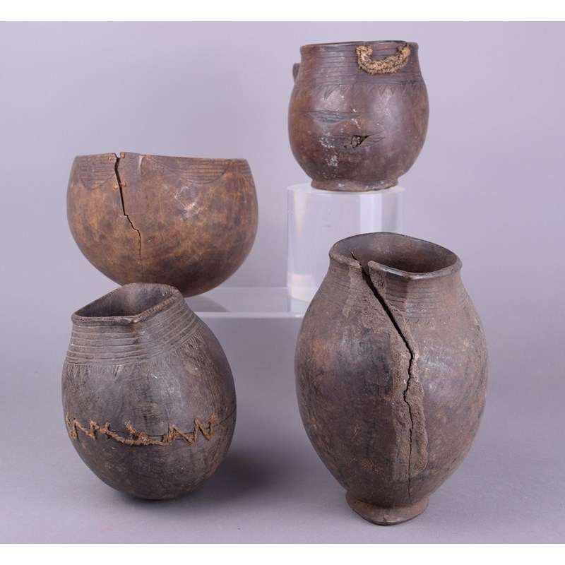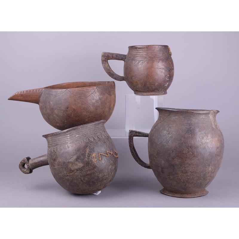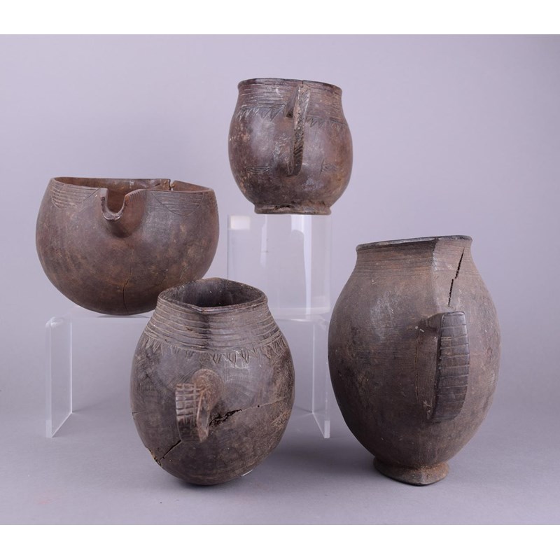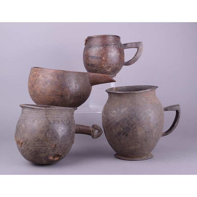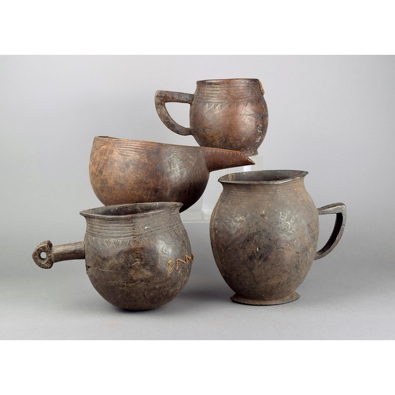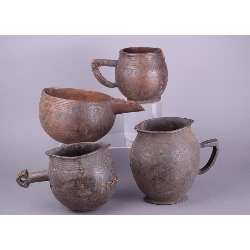 wood, with incised linear decoration, including two with a loop handle, another with a straight handle with a pierced triangular terminal and the fourth with a long spout,