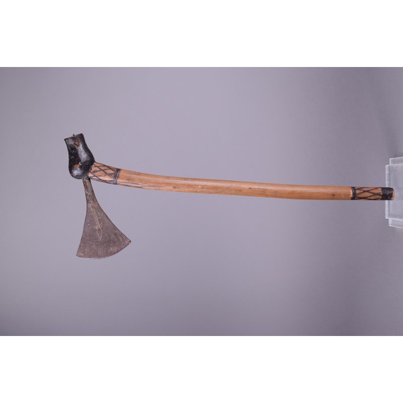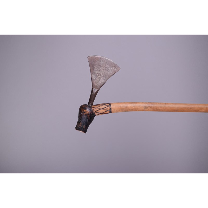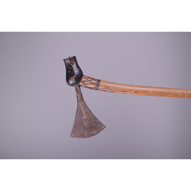 A Ila axe Zambia the wood shaft with burnt decoration and a with an iron blade with incised...