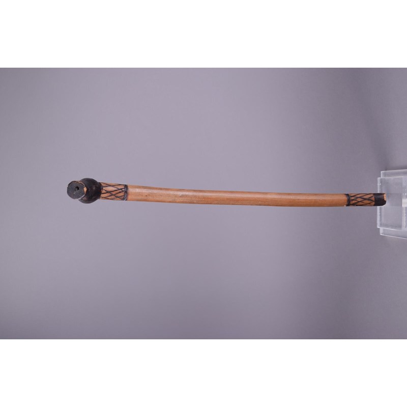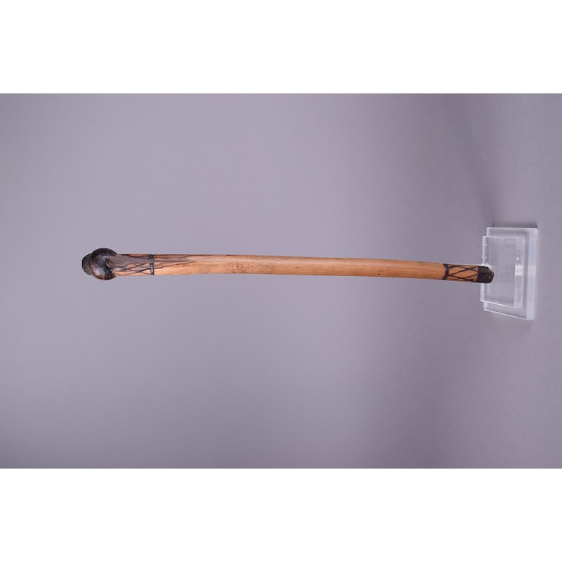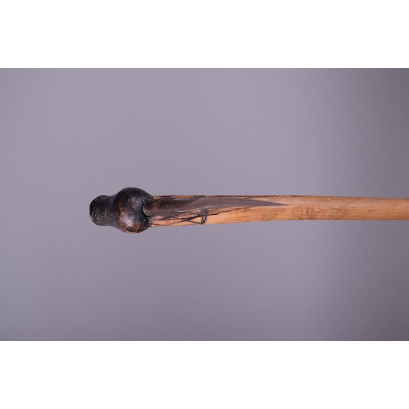 the wood shaft with burnt decoration and a with an iron blade with incised decoration,