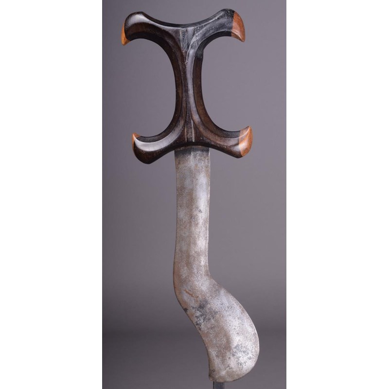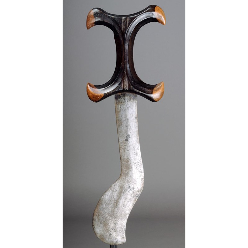 A Hadendoa knife Sudan with a shaped metal blade and carved hardwood double 'C' scroll handle