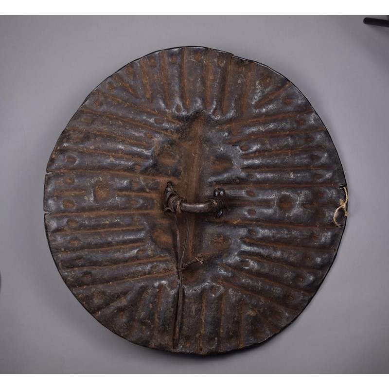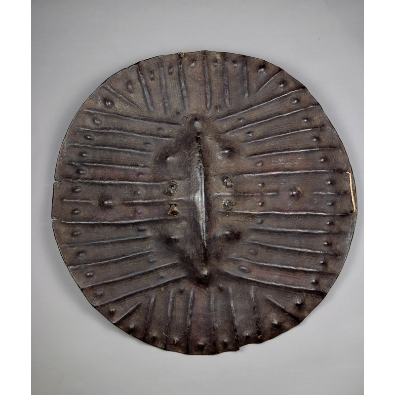 hippopotamus hide, circular with embossed parallel lines and nodules, with fine incised chevron decoration, with a hide handle,