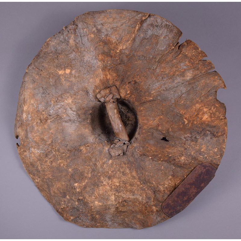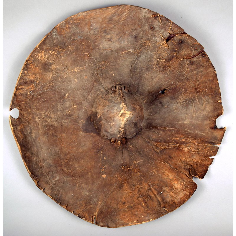 hide with a ridged central boss and cut out circles from two sides and a hide handle,