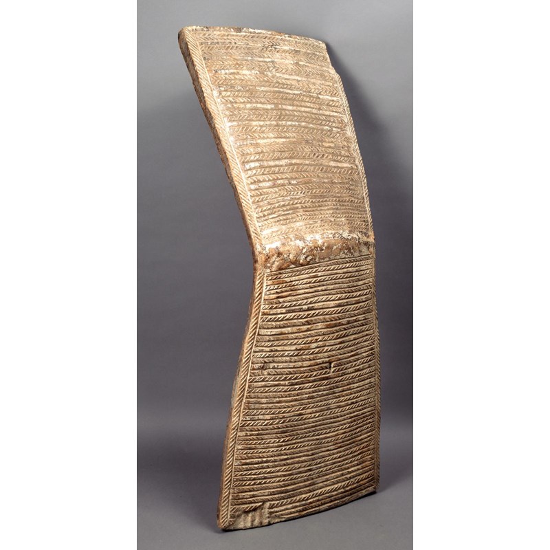 wood, of angled tapering form with linear and chevron decoration, with an integral handle,