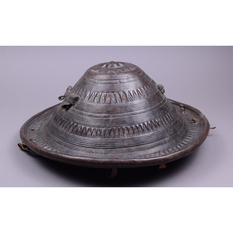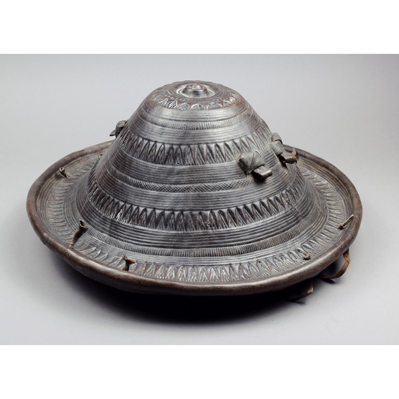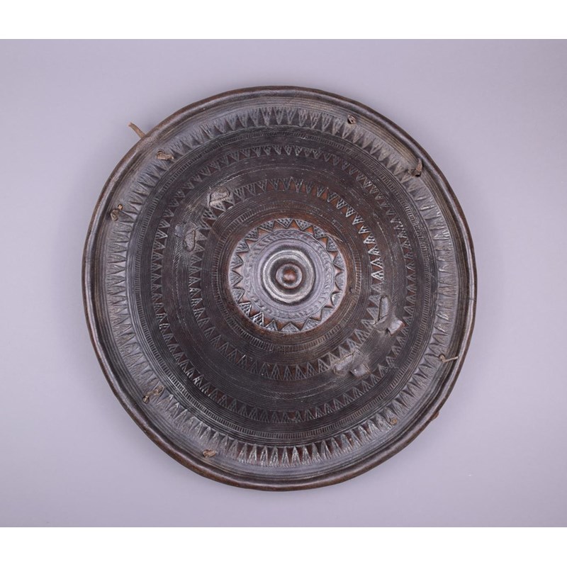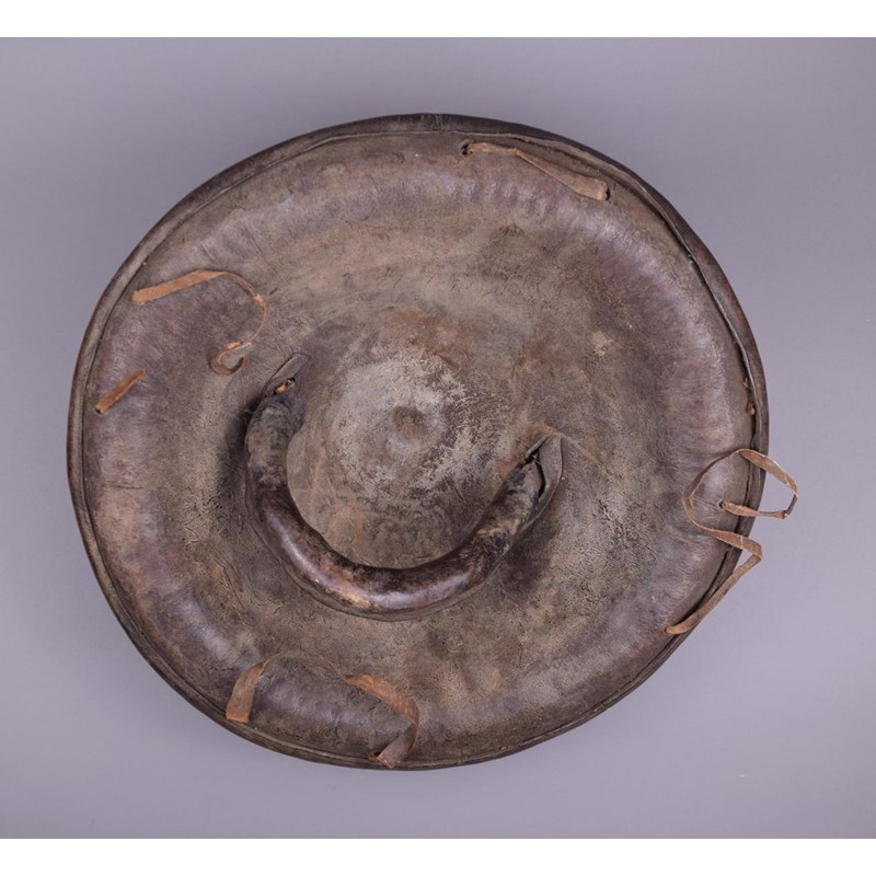 hide, with a central boss and with linear and chevron decoration, with a stitched hide loop handle,