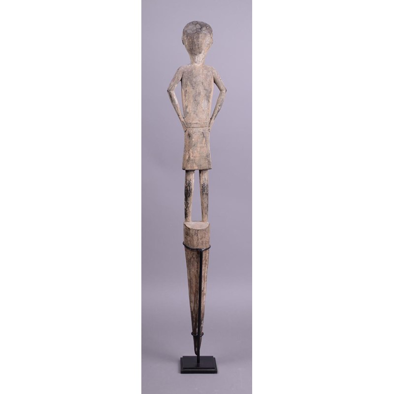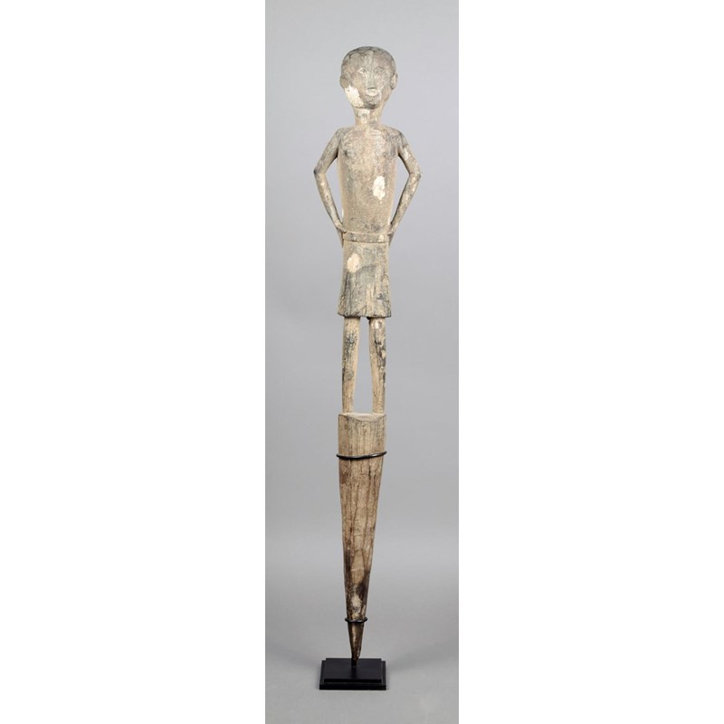 wood, modelled standing with hands on hips and wearing a skirt, on a pointed peg base,