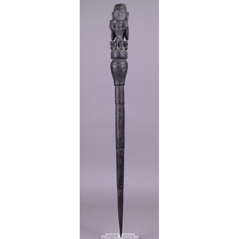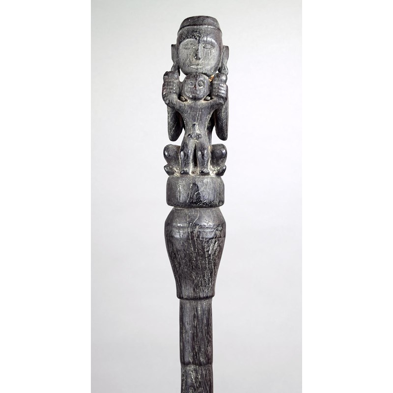 ironwood with a seated ancestor holding a male figure, with a tapering pointed end shaft,