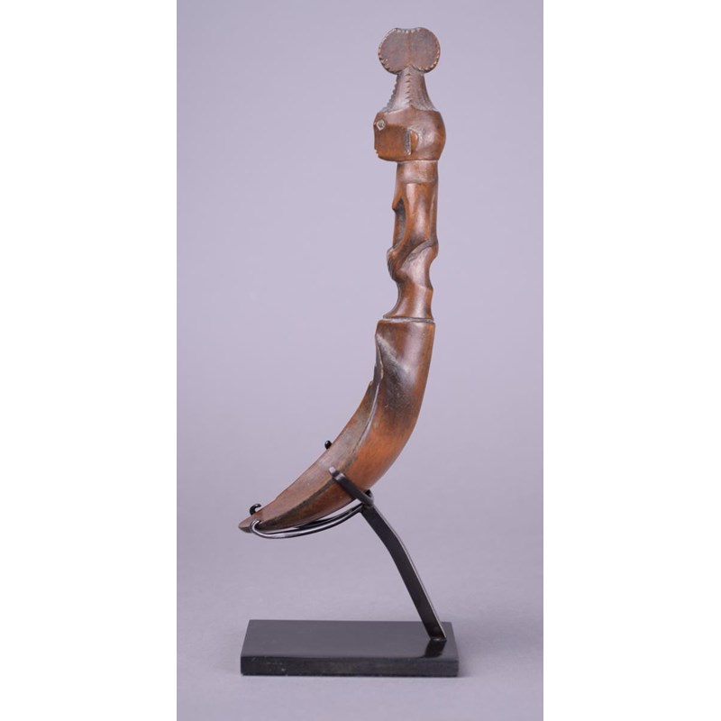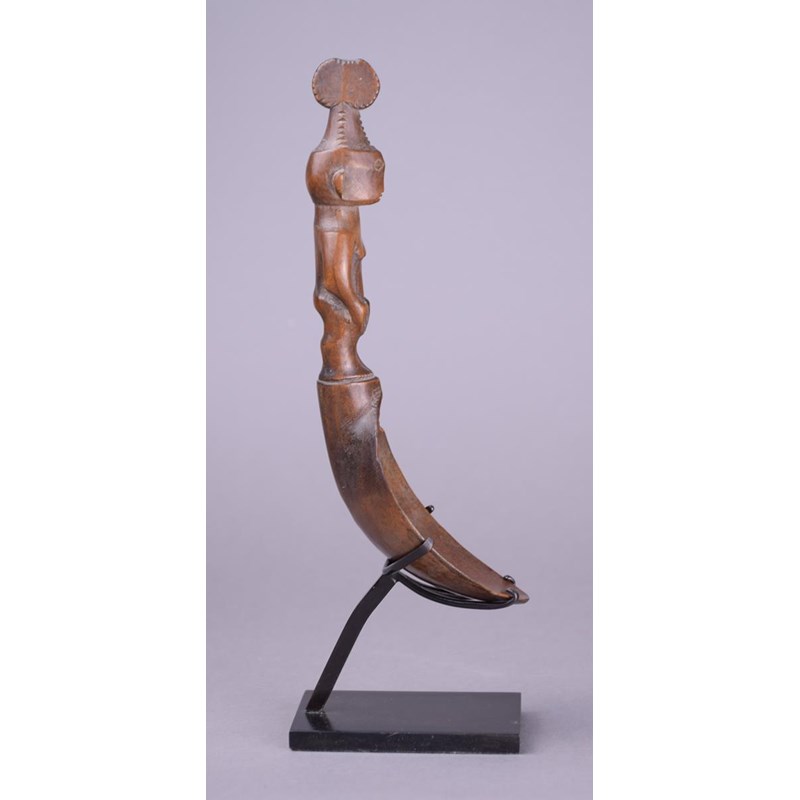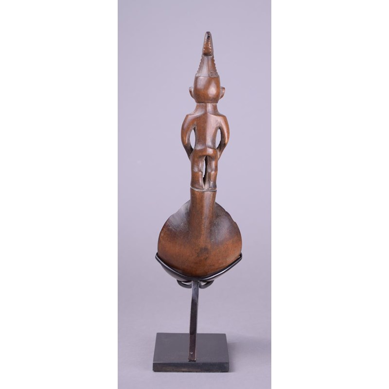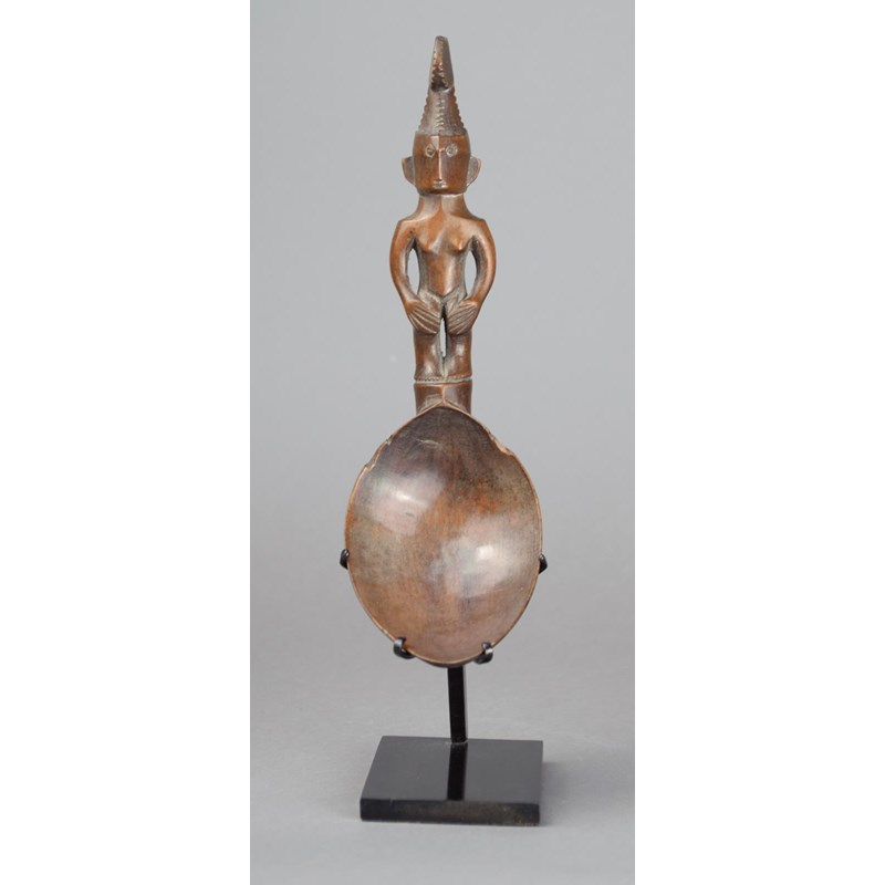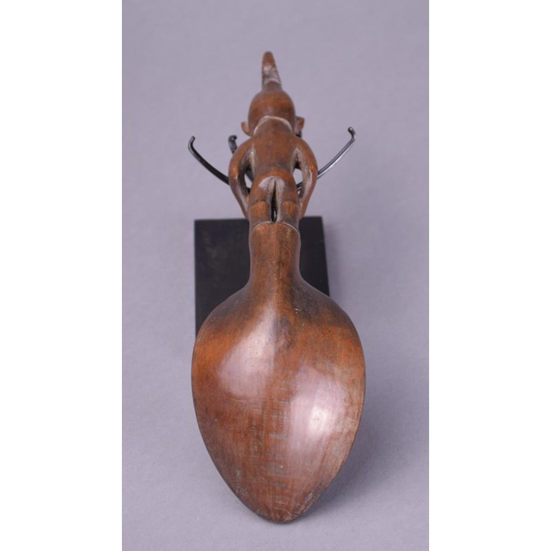 A Ifugao spoon Philippines wood with a standing female handle wearing a double circle headdress