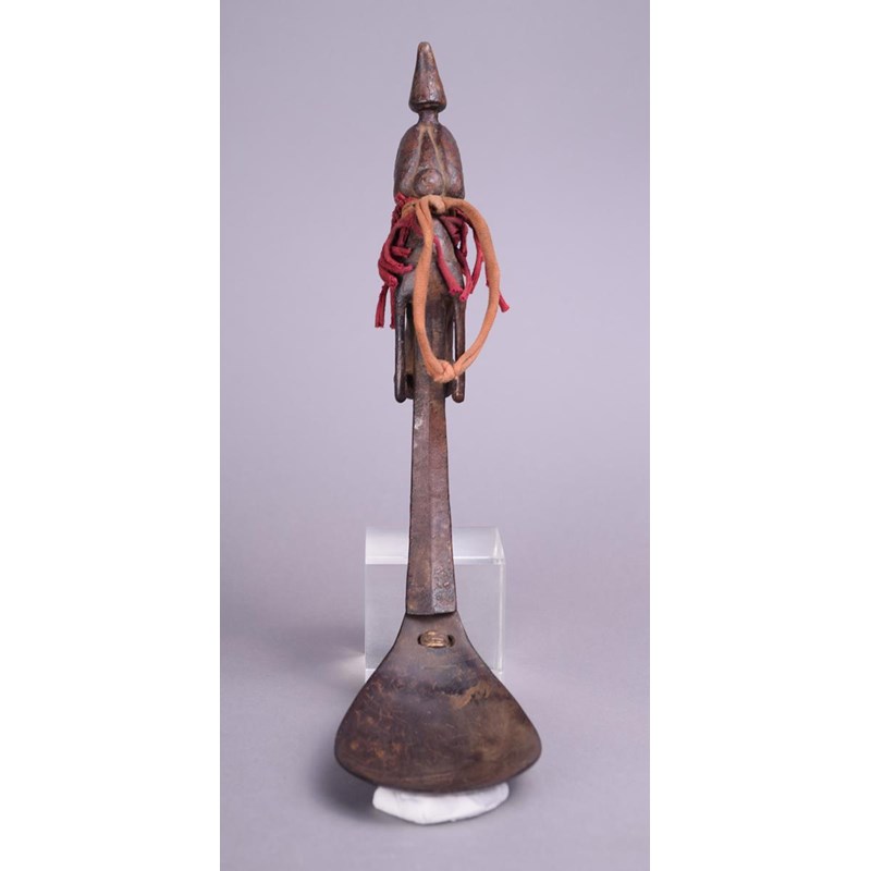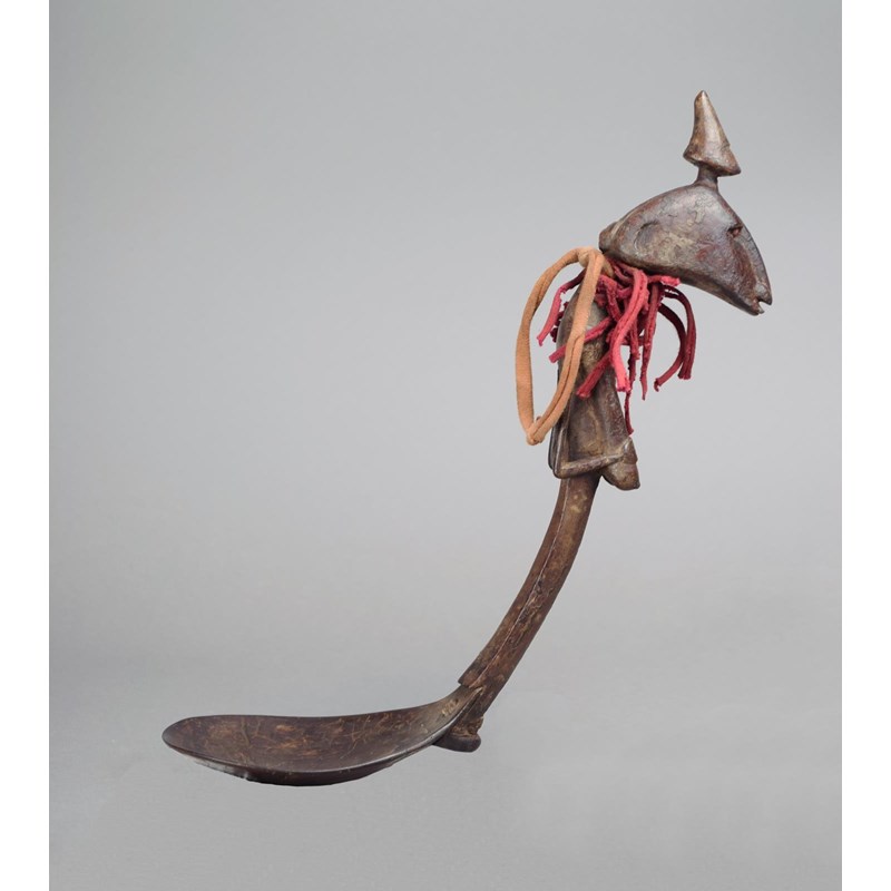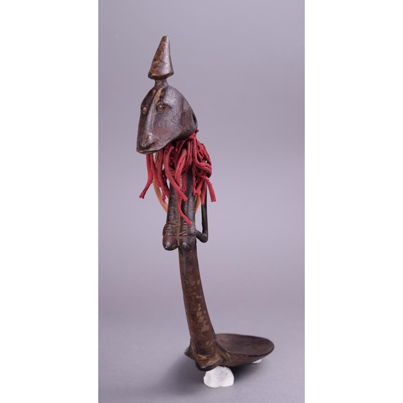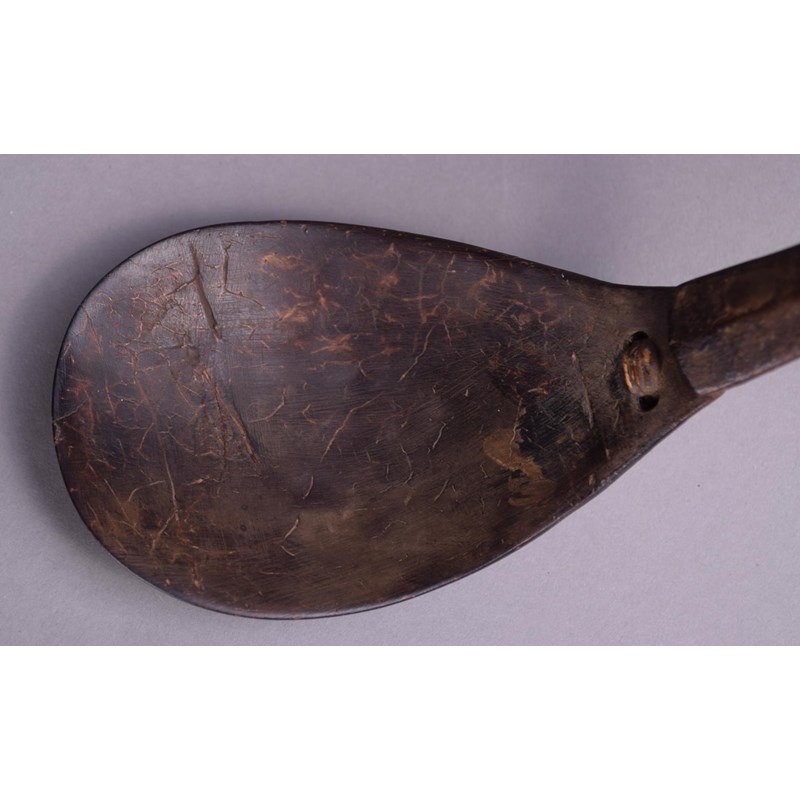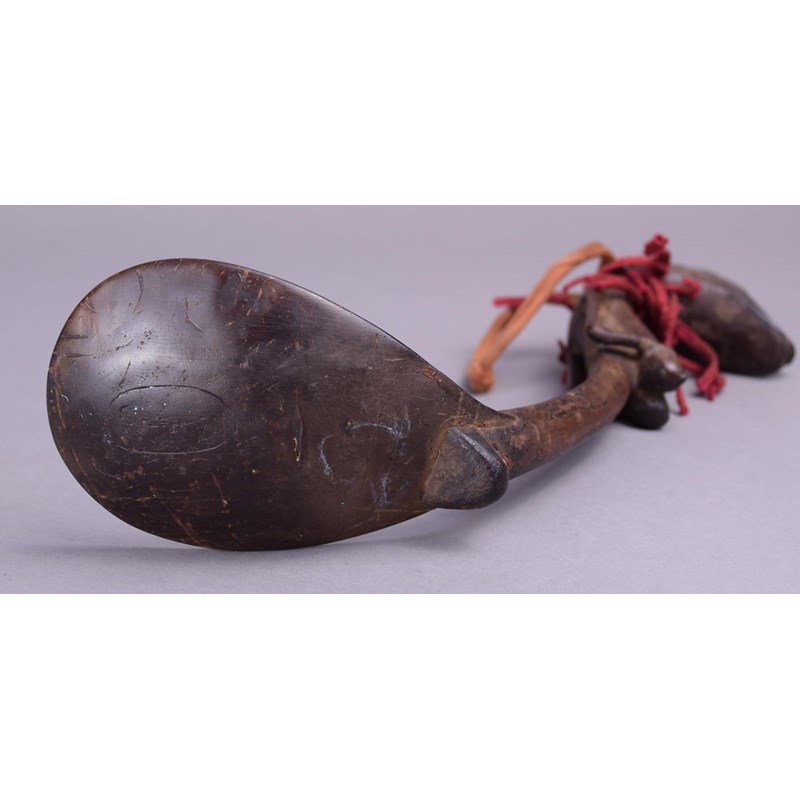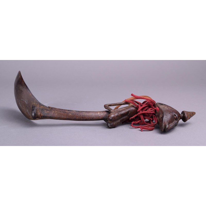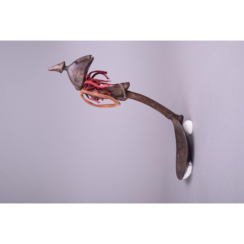 wood, coconut shell, cloth and glass beads, the female bust terminal with a conical surmount, bead eyes and with her hands on her breasts,
